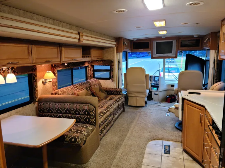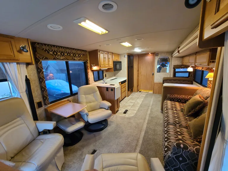 Our Winnebago "Betty" is in like-new condition inside so no burning man. Only 9,000 miles on a smooth driving diesel engine. At 36 feet long, she fits almost anywhere and drives with ease. Everything you need for 5 people to travel in comfort is provided. Just bring clothes and food!Message details of your planned use before submitting a booking request!We are very particular about who can use it and where they can travel. This RV is perfect for a "Stationary rental" at a destination of your choice. Think of it as a hotel that we deliver and set up for you, then pick it up when you're done.The living area has a large slideout wall that doubles the interior space when open. The couch makes into a queen size bed, and the dinette makes a full size bed. The front third of the motorhome can be made private with a sliding door.