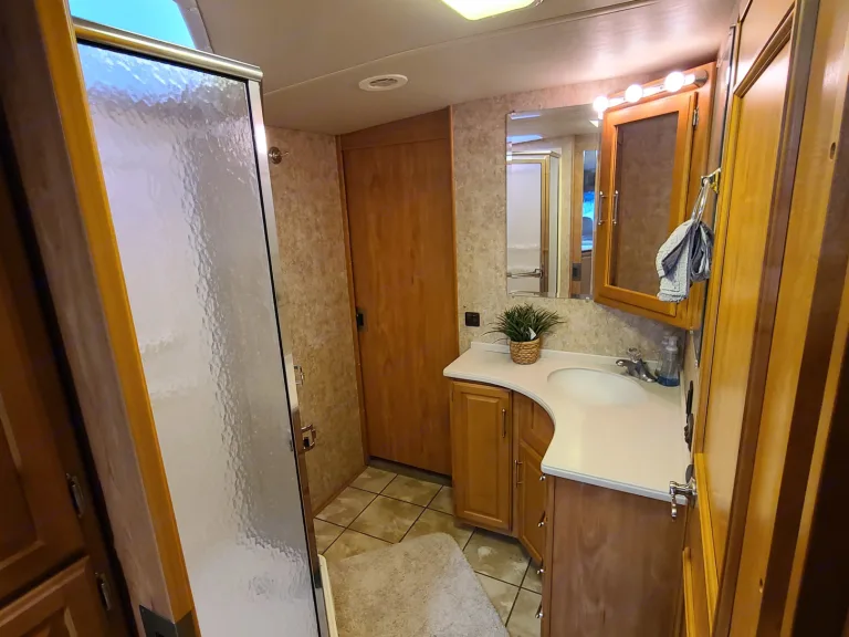 The middle of the motorhome has a big shower, vanity with sink and separate toilet room with its own door.