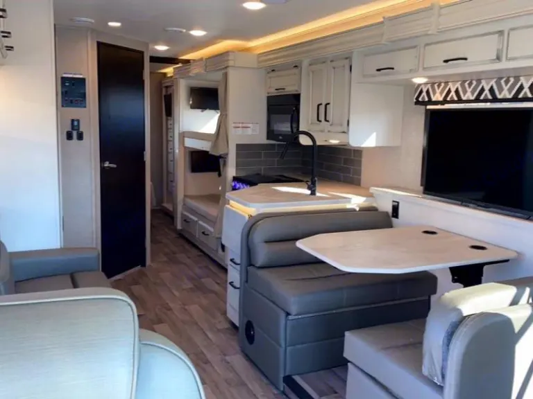 RV sleeps 8-10 people, it has 1 short queen bed, sleeper sofa that folds into a double bed (2 kids/1 adult), 2 bunk beds, dining table folds into a bed (2 kids/1 adult) and another bunk bed that is located above driver & passenger seats (holds maximum of 600 lb). Kitchen w/sink, stove/oven, double door refrigerator/freezer, microwave. Bathroom w/toilet tablets/liquids and special RV toilet paper, water & sewer hoses, are included. RV is 50 amp that runs 2 A/C units for bedroom and living area. Refrigerator works both on propane and electric. RV is expected to be returned in Clean condition or additional $300 interior cleaning fee will be charged. Black/grey holding water tanks must be emptied, fuel & propane must be returned full. Smoking inside is not allowed (if evidence of smoking is present $1500 odor fee will be charged). Trips outside of USA are not allowed. Towing cars is not allowed but small trailers. Bike rack is available for up to 4 bikes - $40. Damages: you are responsible for all damages caused by your wrong handling. Please handle our RV with care. Future renters depend on you bringing the RV back in a good condition. When we do a walk-through both husband and wife should be present. Kids must stay outside so we can train you properly on how to operate this RV. Please do not be early or late. We will be home only at agreed time.What's included-RV grade toilet paper will be provided.