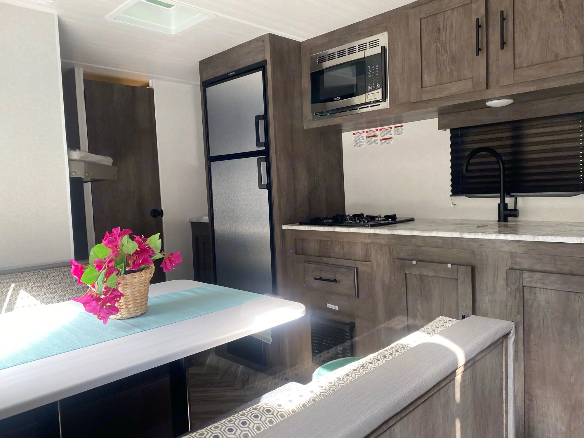 Great for Newbies, and seasoned RVers! Has features that make it easy to use! The interior is spacious with a nice lounge area, TV, DVD, Radio, and USB hookup. Modern farmhouse touches like ship lack by the bed and herringbone floors. Professionally cleaned between uses.