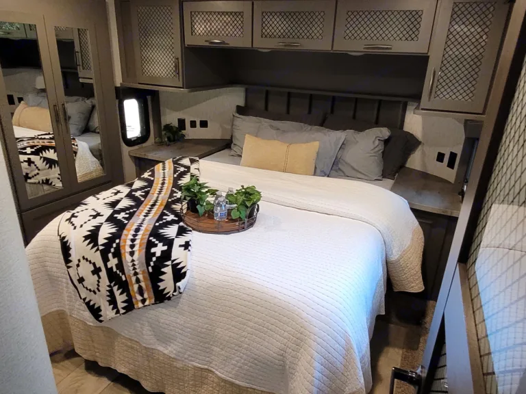 Inviting RV rental bedroom with a comfy bed, stylish throw, ample storage, and bright windows for your next trip.. Grand Design Momentum Toy Hauler 2021