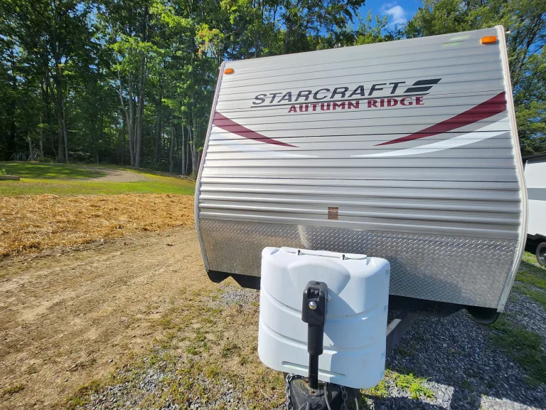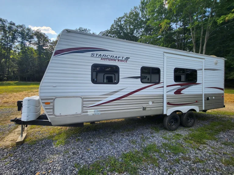 2013 Starcraft Autumn Ridge 245DS travel trailer for sale, boasting a full bathroom, kitchen with stove and oven, queen-sized bed, foldout couch, and dinette that converts into a bed. Tv and dvd player, Additional features include an outdoor shower, heat, and air conditioning. This cozy camper is ideally suited for smaller vehicles and offers a comfortable living space. What's included•tv