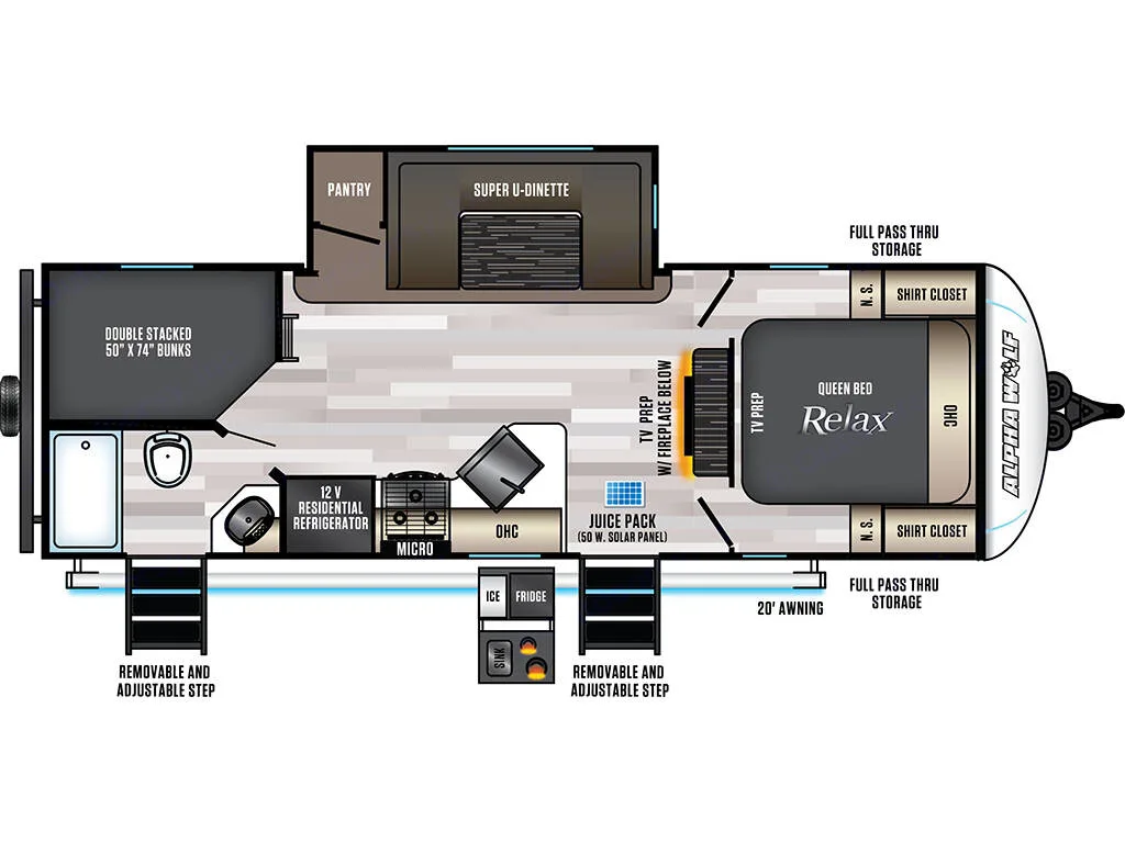 Interior highlights include an oversized u-dinette seating surface for all the kids, dual pots and pans drawers, oversized double bunk beds, a stylish flip sofa for additional seating/sleeping, a master bedroom with dual access, and a farm-style sink. Some exterior refinements include an oversized 20’ exterior awning, dual entry, and a deluxe outside kitchen for the camp chef!Pickup-Time: Between 1 pm - 4 pm