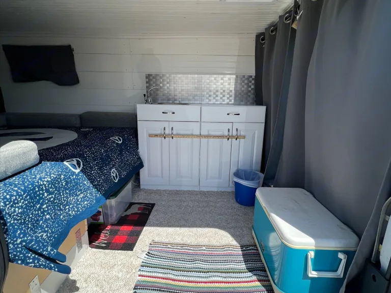 Conversion has one bed that is pretty large and converts into a table for dining as well. The benches are perfect for storage needs. There is a nice counter space with a pump water sink. This means there is a holding tank for fresh water under the sink that drains into another tank to empty.