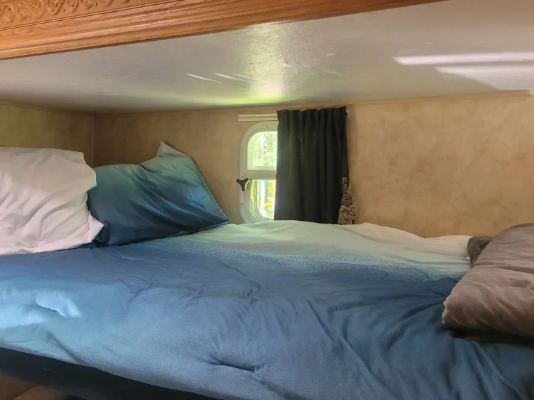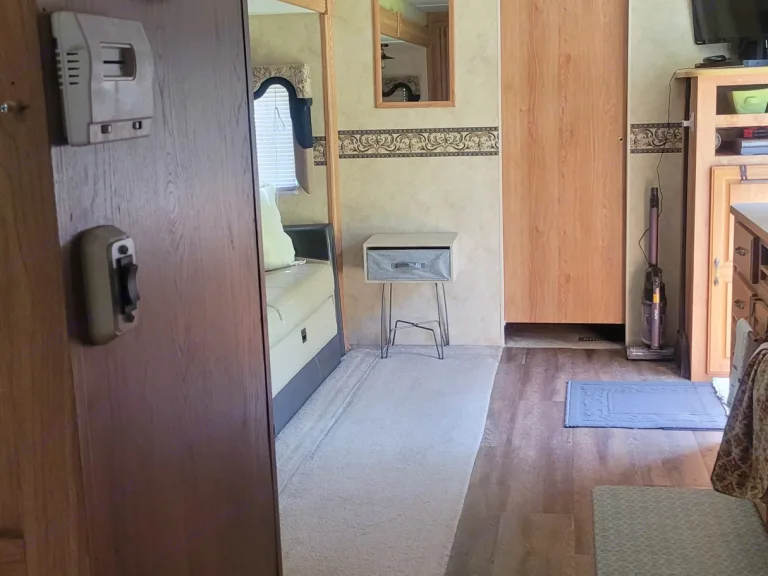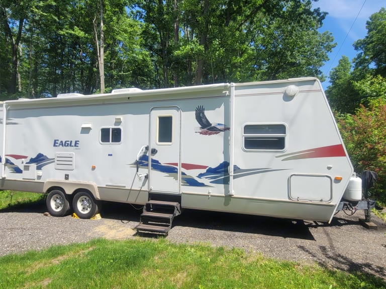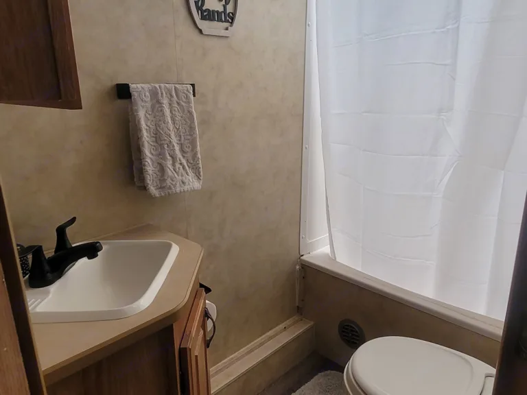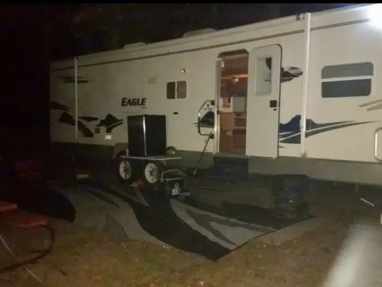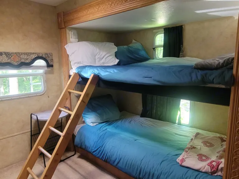 Enjoy camping in this well kept travel trailer with room for the entire family! 2 bedrooms for extra privacy and 2 slide outs for all the room you need to relax. Living room equipped with Super Slide and full size couch with full size pull out bed. Also includes a 3 inch memory foam topper for added comfort. Guests will fight over this bed! Kitchen includes table with 4 foldable chairs. Kitchen equipped with fridge, freezer, stove, oven, microwave, coffee pot and all you need for a grill. Master bedroom includes his and her night stands and closets, door for privacy, remote operated fan, full size bed with storage underneath. Bedroom number 2 comes with a slide out for extra room, a set of bunk beds with true twin size mattresses, sliding fabric door for privacy, closet and drawers for clothing and pop up table for convenience. Air conditioning and heat all ran with thermostat. We deliver and set up. Sleeps 6 easily and has room in the 2nd bedroom for a small air mattress, child cot, or pack n play if necessary! Includes dinnerware and cookware. Just bring your chairs and you will be all set to enjoy the outdoors!This rental is delivery and setup only. We will deliver to your destination, setup, and pickup at the end of your stay. What's included• small outdoor carpet 10x10, bedding, towels, some toiletries, kitchen dinnerware and cookware, television with roku capabilities. outdoor and indoor trash can.Recommendations**ATTENTION: IT IS REQUIRED TO ADD THE DUMPING ADD-ON IF ACCOMMODATIONS DO NOT INCLUDE FULL HOOK UP WITH SEWER.