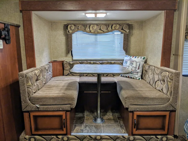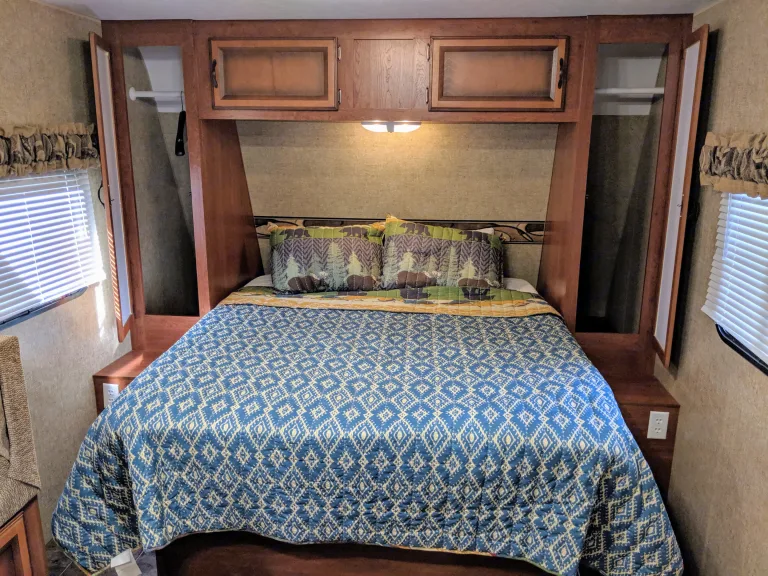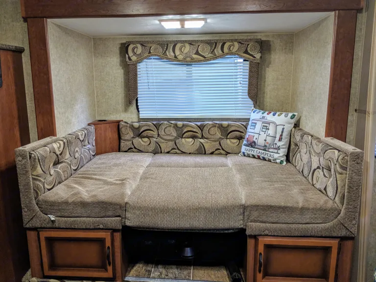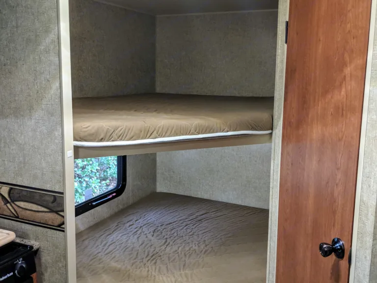 Awesome bunkhouse style travel trailer that can easily accommodate 7-8 people. Queen size bed, two full size bunks, and the dining area also converts to a bed. Full kitchen, including: sink, gas range and oven, fridge. Electric tongue jack, electric awning, electric slide out dining area. Bathroom has a commode, sink, vanity, and tub shower. Dry weight is 4400 lbs and can easily be towed by most full size trucks. Great all around RV! Pickup and drop off and/or delivery and recovery dates must be on a weekend day