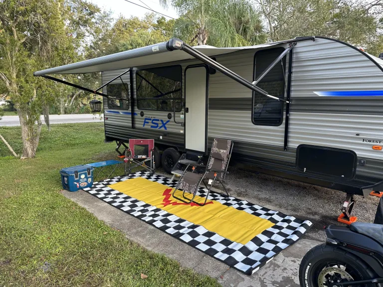 Are you planning to head to Bike Week, Nascar, or a Hunting Trip then this is your girl. She has up to 2,800 pounds of payload capacity to haul 2 of your Harleys or a Trike, or your Golf Cart, or even a small Side By Side. At the same time, she has a private bath and bedroom unlike most toy haulers. She has room for your spouse, kids and Fur Babies or you and 3 of your buddies that want to tail gait at the infield of Daytona, Sebring, Homestead or the parking lot of your next football game. What's includedShe comes fully loaded with freshly cleaned sheets, towels, pillow, cooking utensils, coffee maker and the sorts. All you need to bring is your favorite coffee, food, beverages, and toiletries. She is stocked with TP, Paper towels, Dish soap. Her fridge is cold, the AC chills, the water heater is ready and her awning provides all the shade you need. RecommendationsShe's perfect for you to tow her to Daytona, Sebring, Homestead, NCAA football parking lots, any of the Springs in FL, Disney, the Keys or any destination in FL , GA, or AL you'd like, or we can delivery and set her up at most RV parks in Brevard or Indian River County such as Long Point, Sebastian Inlet, Wickham Park, Ronald McDonald or Vero Beach Kamp.