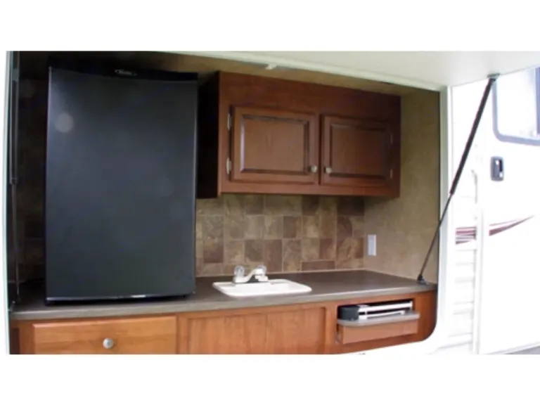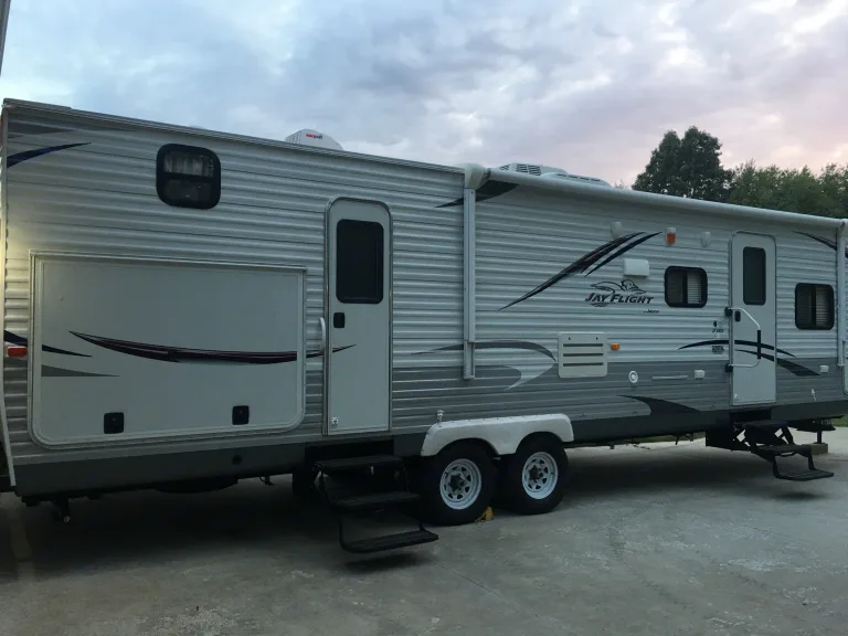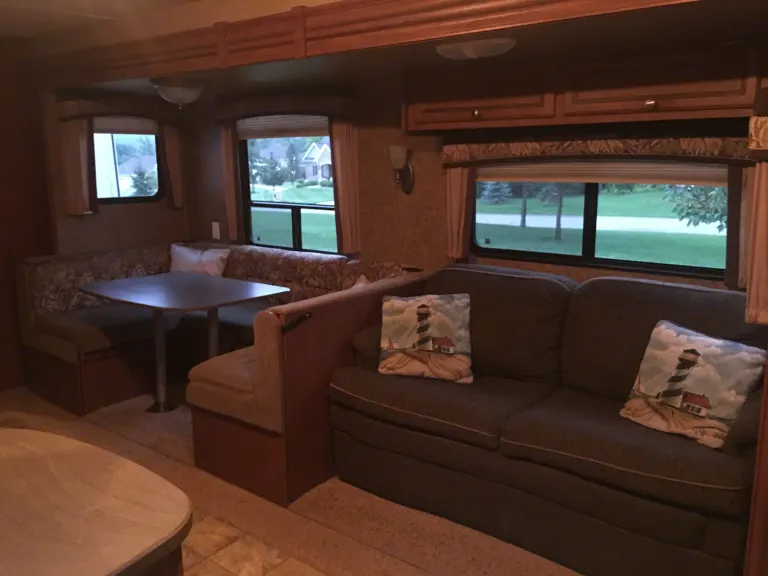 Our beautiful RV is 32 feet, with a nice flat screen TV. It has a front queen bed with a newer comfortable mattress from a mattress store, (as traditional trailer mattresses tend to be uncomfortable). There is a dining room/couch slideout opposite the kitchen. There is a second slideout with a large bunk, a smaller bunk and a double futon/couch. There is plenty of room for your children or grandchildren in the back! The bonus of the trailer is the outdoor kitchen, complete with a refrigerator, stove and sink. This trailer also has an outdoor shower. There are two entrances to the trailer, the main door and a second in the bathroom. The trailer has been kept very clean and you will make wonderful memories! Delivery and pickup available within an hour radius for $150 delivery/set up fee. We do ask that you vacuum and clean the trailer before we pick it up with the vacuum and cleaning supplies we have left in trailer, as this will ensure the full refund of your deposit. Come see Beautiful central Michigan!
