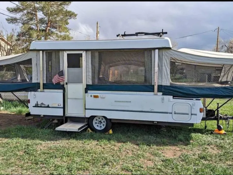 1999 Coleman Utah pop up camper. This baby is easy to tow, weighing in at only 2400 lbs. Set up only takes about 10 minutes and there is so much room inside. The camper has a sink with a water tank mounted underneath, a small fridge, a heater, a two burner stove, and has lights and outlets. There are two king beds, a sofa that pulls out to a bed and the dinette folds down for more sleeping room. Also has quite a bit of storage to keep your things organized! Great for families! Perfect camper for anyone looking for a quick getaway!What's includedFresh linens, 4 person dish set (plates, mugs, bowls and silverware)