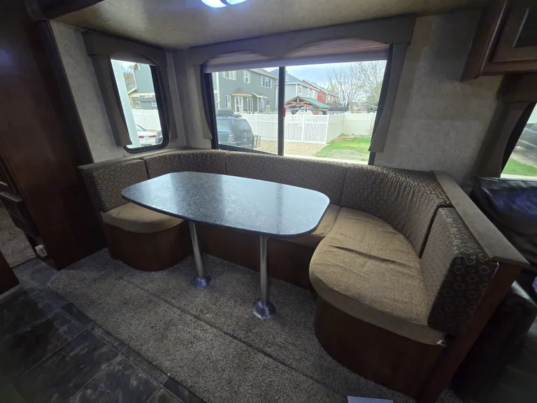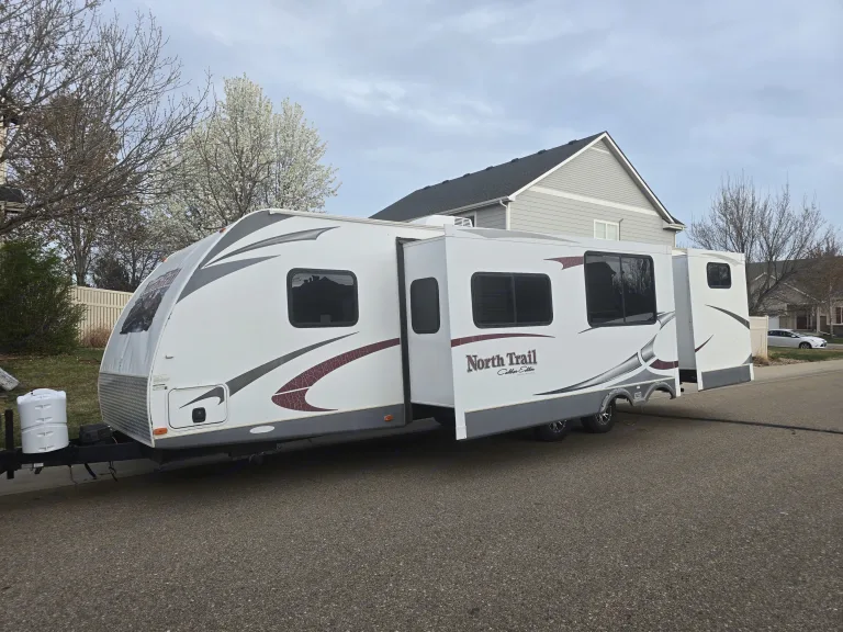 Here's a beautiful 34 foot long travel trailer that sleeps 10! Two Slide outs and an open floor plan mean you'll be camping in comfort with all your friends. From the solid surface counter tops to the large bathroom you'll feel right at home. Watch the game on the 32" LCD swivel TV from the forward bedroom or turn it around to view from the large living room. Sleep in on the upgraded master mattress while the kids have fun in the children's bedroom, with 4 bunk beds in the back. The kids can also have a fun getaway with their own entertainment center. You'll be hard pressed to find a camper this large and still so lightweight for pulling at just over 6500 lbs. A full shower inside and an outdoor shower keeps you and your guests clean in the wilderness or while traveling. So pull up a chair at the outdoor kitchen to watch TV in the summer or snuggle up inside during the winter with your pets. With large storage capacity you can bring the whole family!What's included• This Rv is fully stocked
