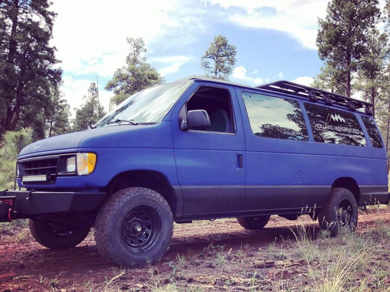 The Holy Roller is a freshly rebuilt 1993 Ford e350 that features a brand new expedition style camper build. With a queen sized bed, a sink, cook stove, refrigerator and bunches of storage, this van is comfortable for 2 people and is dog friendly (no cats allowed, dogs not allowed in the bed). Comes fully stocked with pillows, sheets, blankets and cookware and utensils for 2.Contact us about the “Flag Local” package which includes a stocked pantry and refrigerator with goods from Flagstaff local businesses and producers!As well as being super comfy inside, The Holy Roller is equipped with a super versatile 100” Rhino Rack roof platform for your storage needs. We also offer various accessories available as add-ons (message for availability and needs). She’s also tricked out with a 2” lift, a custom front bumper and a eye catching blue bed lined exterior. This baby will be the perfect getaway van for your next adventure. Take it for the weekend, week or month!Rules: