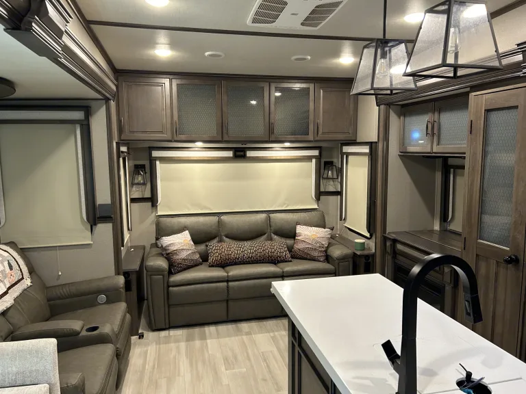 House on wheels for your home away from home!Unique two bedroom setup with open living, dining, kitchen. Island countertop with all modern amenities. King RV bed in master bedroom. Two pull out couches that are between a full size and Queen size. One twin bunk.Smart TV in the living space with PS3 that can play DVDs. Bluetooth capable sound system with both indoor and outdoor speakers.Mobile Wifi is available at request! Please inquire for more details.Enjoy the outdoor entertainment space that includes a cast iron griddle, mini-fridge and tv! Two large awnings provide shade during the day and outdoor lighting at night.Linens and bath towels provided. Stocked kitchen with dishes, cookware, utensils, and cups. Keurig Duo with K-cups provided. Basic cooking necessities such cooking oil, spices, etc.WE Deliver! Delivery includes set up of the RV and breakdown at the end of your stay. If you have more questions about this process send us a message!Note: Oven does not work, but microwave has a convection oven setting that works perfectly.Pick Up/Drop Off times are flexible depending on your needs.What's includedRental comes with 4 camping chairs and fold up table. Two sets of fresh linens for each bed and two pillows per guest. Kitchen and dining equipment fully stocked for all cooking and prepping needs for both inside and the outdoor griddle. Keurig Duo, electric fireplace, Apple TV in master bedroom and Roku TV in living room. Generator as needed. RecommendationsGrand Canyon