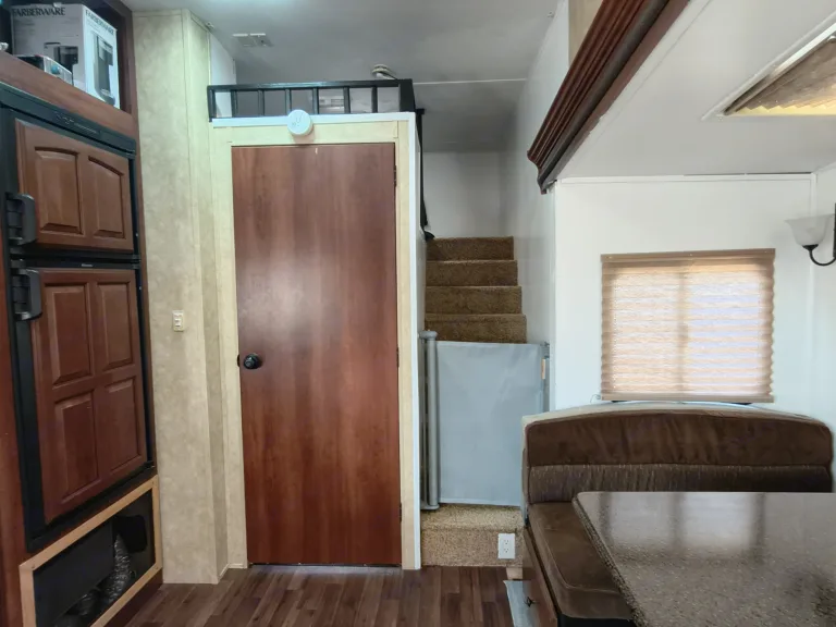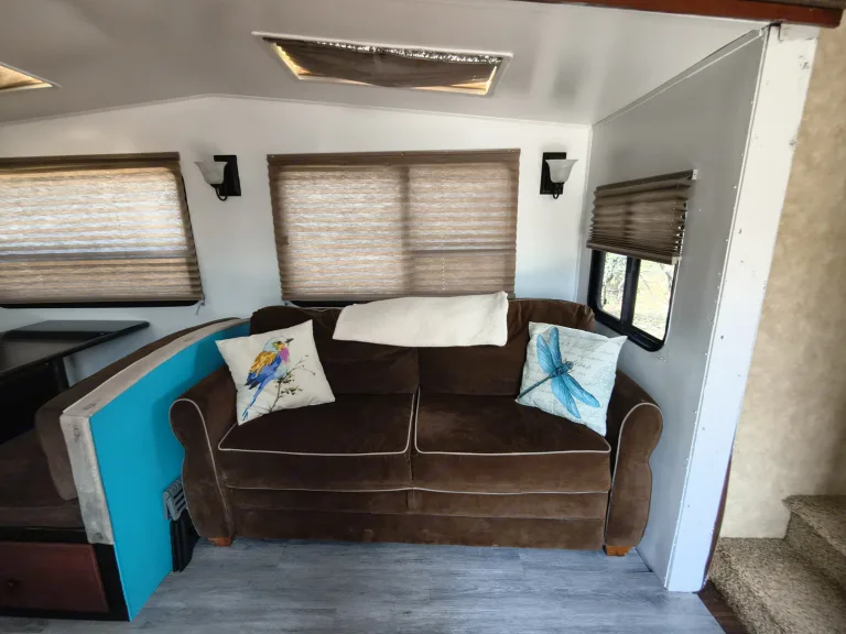 38’ fully stocked 5th wheel with 2 slides. Two bedrooms and a loft allow for privacy and plenty of sleeping areas while camping. Main bedroom has an upgraded short queen memory foam mattress, and two closets give you plenty of storage. Second bedroom has its own slide out, closet, TV, and a couch that easily folds out to a twin bed. The loft is easily accessible by a set of stairs (not a ladder!) and has a futon mattress. Loft is tall enough for someone under 5’ to sit up without hitting their head. Installed baby gate keeps the stairs safe for little ones. 2 A/C units help keep everyone comfortable (must have 50 amp plug in order to run both A/Cs).