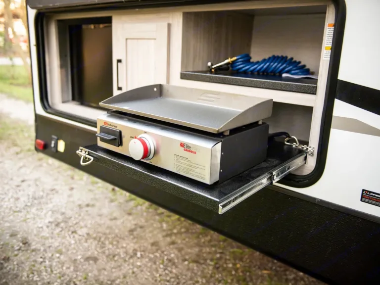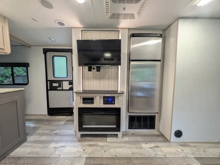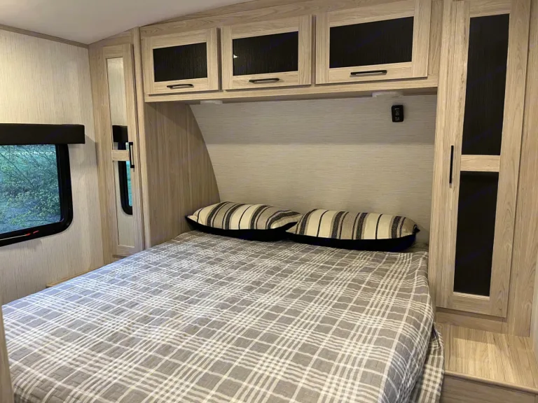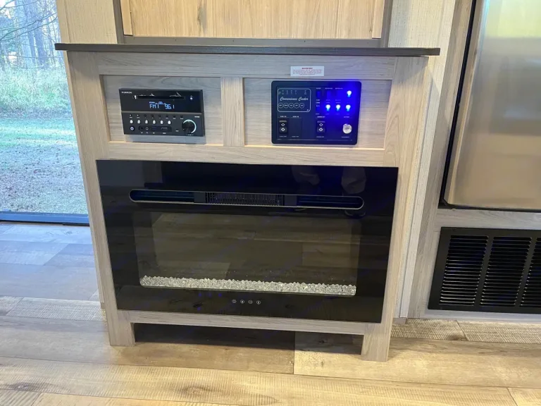 If you're looking for a luxury experience in a fully decked-out trailer, this is it!This beautifully detailed unit has all the comforts of home.The slide out for the living room creates a big open space for movies on the flat screen, with an electric faux fireplace and dual zone climate control.There's also everything you need to keep the party going outside. The outdoor kitchen has a flat top griddle, perfect for eggs, pancakes and bacon. There's also a mini-fridge for relaxing with a cold drink under the huge motorized awning with lights and outdoor speakers.Also important, this unit has motorized stabilizers to make sure you're not sleeping at an angle even in tough terrain.The bathroom is spacious with a full size shower.This is the perfect solution for the whole family or group of friends to enjoy a nice long stay in the great outdoors or at a big event.You can also get it delivered and set up, so you can just show up and move in!Sleeping Accommodations: