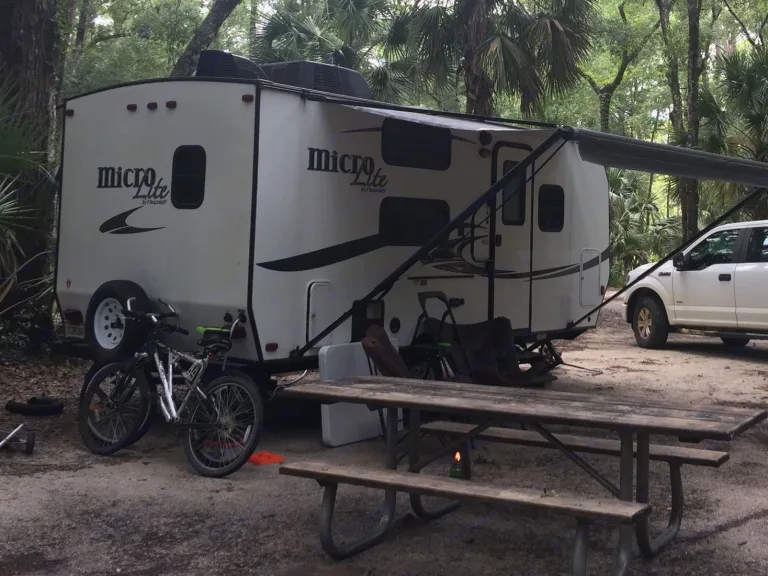 This camper can be plugged into electricity and water or can be self contained. It has a 36 gallon fresh water tank. The kitchen has a sink, 3 burner stove top, large refrigerator and microwave. There is a TV with antenna to pick up local channels. Speaker system inside and camper can connect with Bluetooth, AUX or CD. It has air conditioning and heat. A queen size bed, full large bathroom with tub/shower. Also has bunk beds. A dinette area and a sofa. and the outside has a shower! It feels roomy when you're chilling inside.