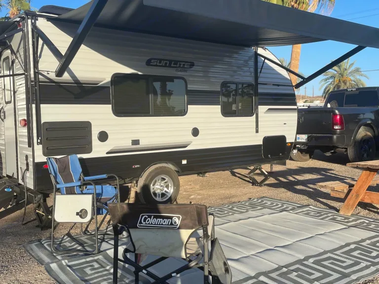 Light weight and easy to tow! This cozy travel trailer comes fully equipped for your trip. Our family of 5 takes pride in our trailer and we want you to enjoy it just as much as we do.Sleeps 4 (5 if you have children) Queen bed, single bunk and single dinette/bedThe trailer has an awesome gas line hookup on the side of the trailer so you can bring your grill for some outdoor cooking. It is also equipped with 2 large awnings to provide tons of shade. And a shower hose outside to rinse off if needed.Entertainment includes a Smart TV and Indoor/Outdoor speakers for the stereo system. What's includedFresh linens
