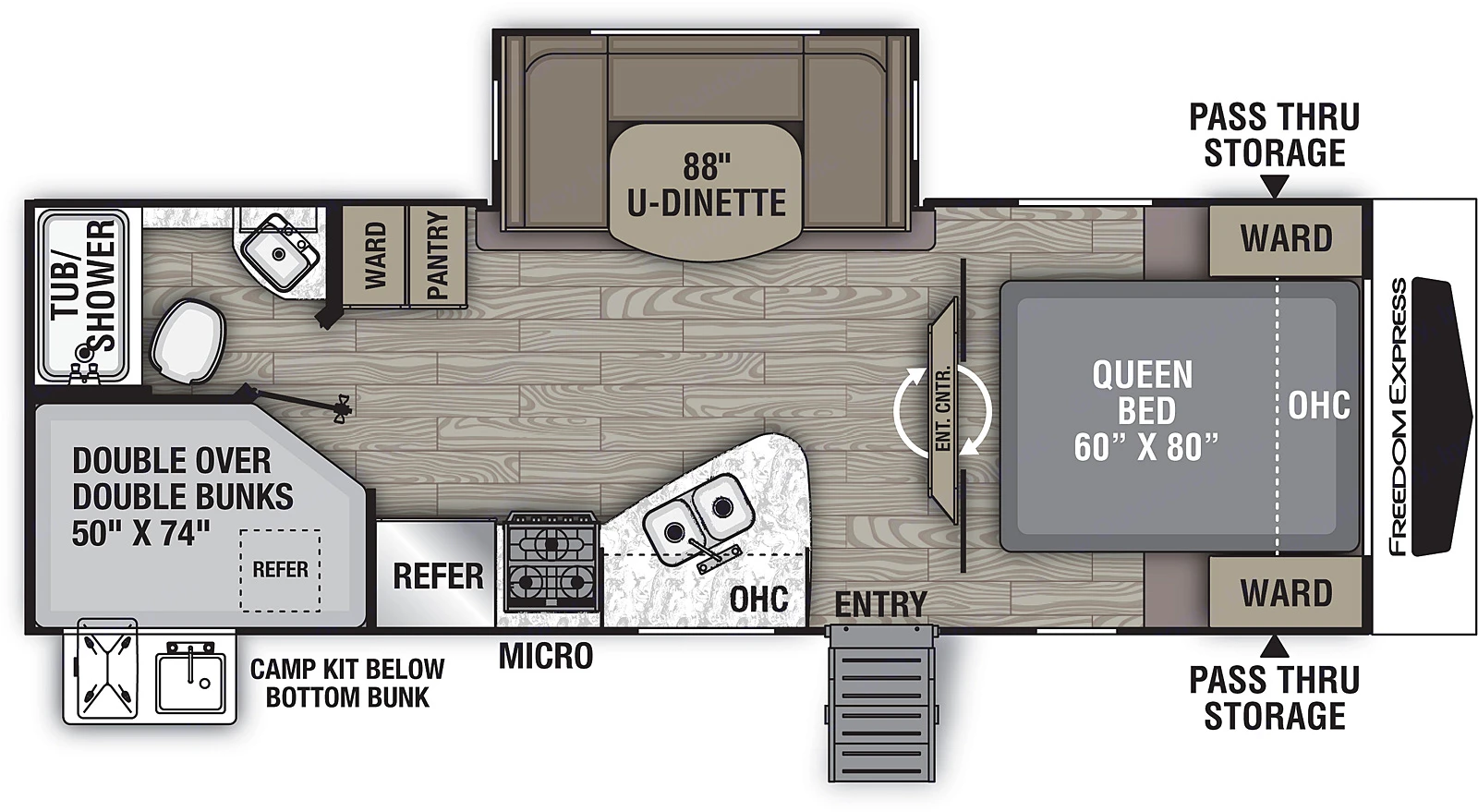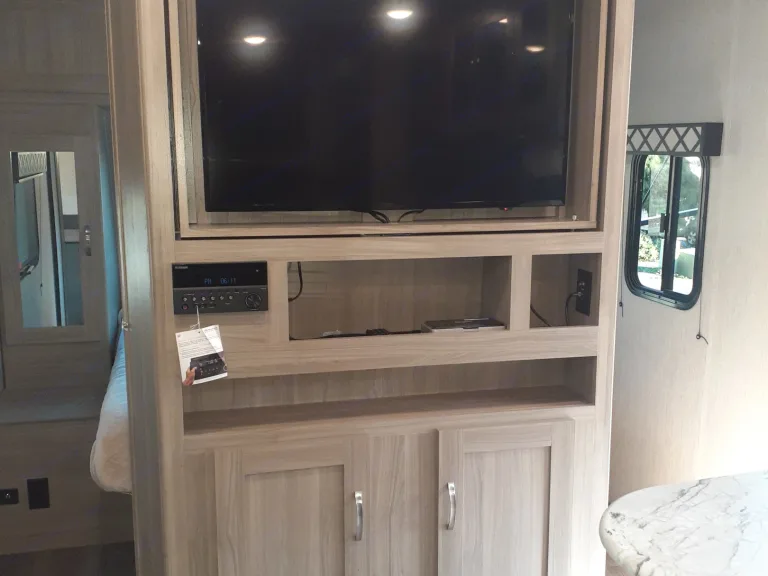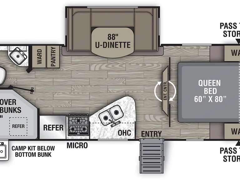 Plenty of room for big families! 2 Double-sized bunks for the kids, the standard dropping dinette for extra sleeping area, and a separate Queen sized bed in the master bedroom with closing doors for privacy! Unit has an outdoor kitchen option for preparing meals and snacks outdoors with the rest of the family! Full entertainment system includes 39" flat screen T.V. and DVD player, Bluetooth connectivity, and even outdoor speakers for listening around the campfire!