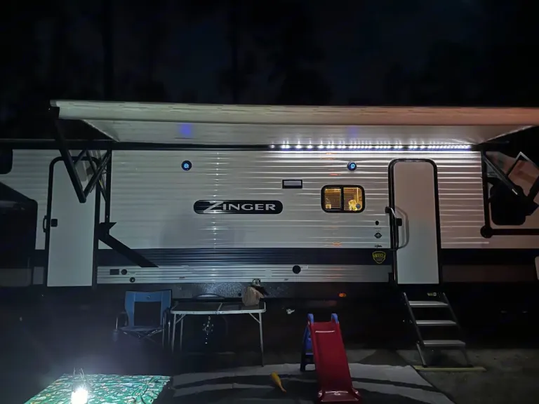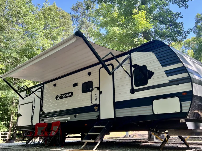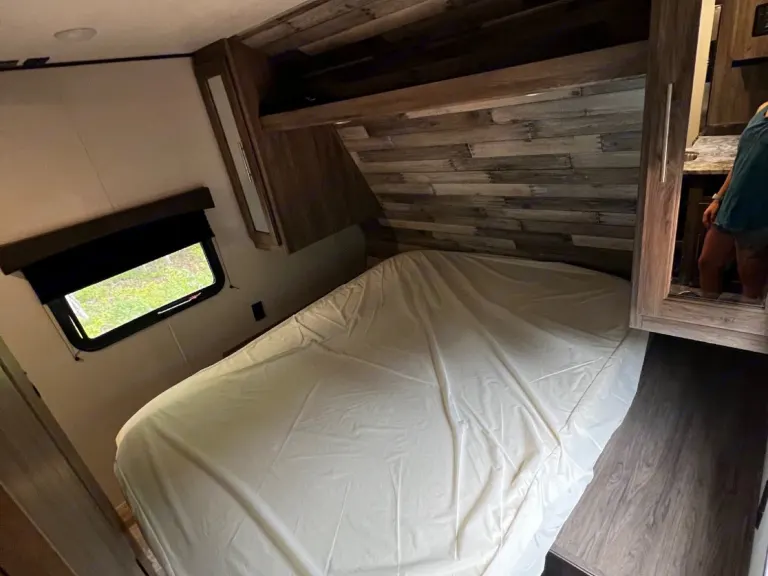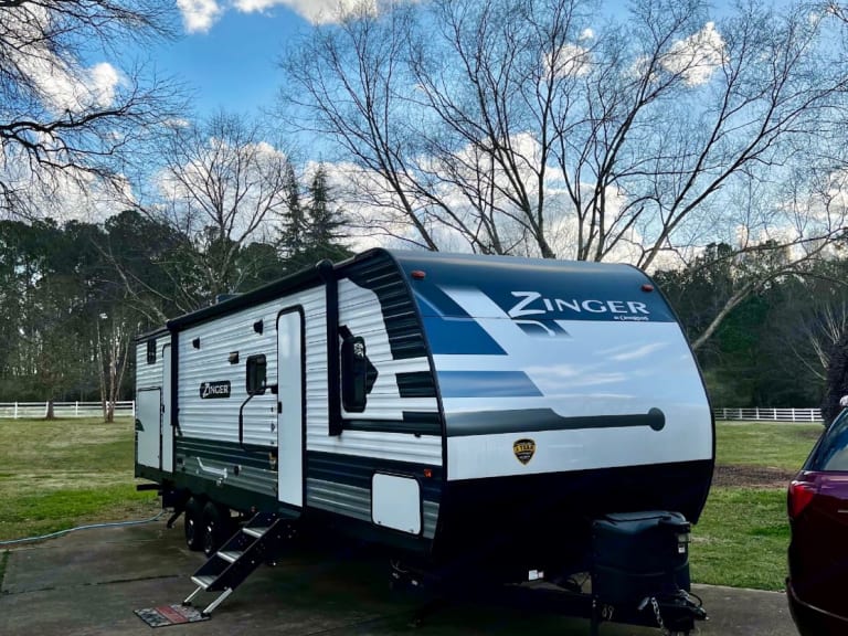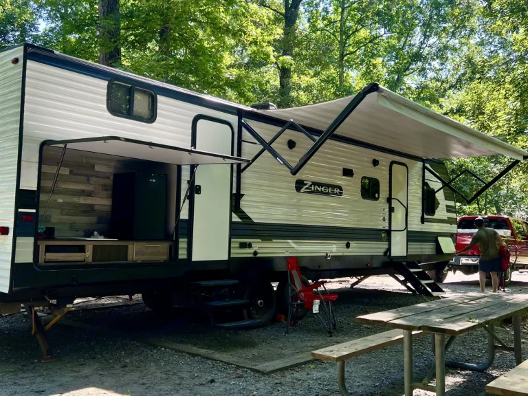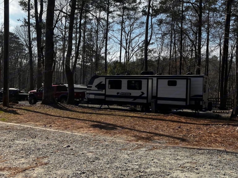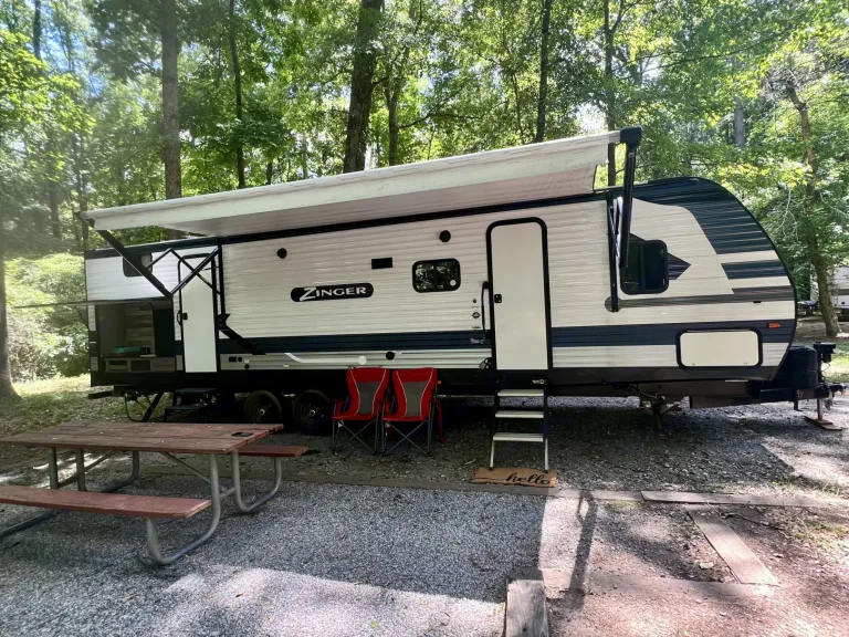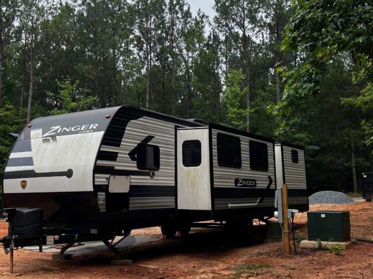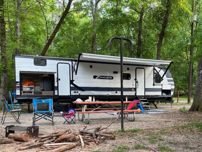 Camo Camping offers a 2021 Crossroads Zinger for all inclusive glamping experience to include delivery, set up, and pick up to local destinations of your choice! This is a spacious 37 foot camper that offers a queen bed, two fold out couches, one convertible table, and three bunks for a comfortable sleep for up to 9 people!! Enjoy some time in the great outdoors with a large awning, outside speakers, direct access to the bathroom, and an outdoor kitchen that includes a mini fridge and gas stove! Rainy outside?? That is okay, the inside offers a TV, sound bar, and a full kitchen for a relaxing day inside as well!What's included2x camp chairs, 2x lanterns, pack of reusable roasting sticks, linens and blankets, pillows, camper safe toilet paper, dishes and utensils, and dish soap. Basic cleaning supplies to include all purpose cleaner, Lysol wipes, broom, and mop.RecommendationsLocal state parks offer great amenities like water falls, hiking, playgrounds, historic sites, and so much more for family fun or a relaxing getaway!Other things to noteNo pets and no smoking.