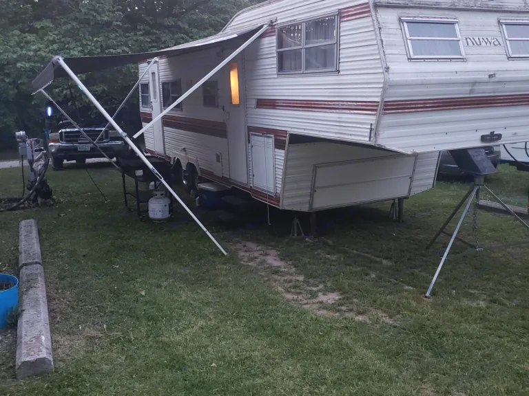 The 5th wheel is old and big. Very good heavy built camper. Everything works no leaks in the roof has a mini freezer fridge w/freezer. queen size bed that's like new heated blankets and cold ac. propane or electric water heater propane stove 12 volt lights with 110 plug in all over the 5th wheel. Lots of storage for dresses or shorts. Several cabinets for food for weeks Like new awning that makes great shade. Has a recliner in rear of camper has options of 2 TVs with a cable box with over 1000 movies and shows. 5th wheel has only the one bed but we do have air up mattress to put in the rear of camper to sleep 3-4 kids. we have 4 ranging from 17-11 and sleeps all of us in the ac. We also have a tent if wanting to take it for some alone time with out kids. Must be hooked up to 110 for ac to work along with the freezer holding tanks work I myself haven't used them in years thou. if wanting e them I will make sure they work with a little notice. I will deliver to anywhere local and set up for a fee