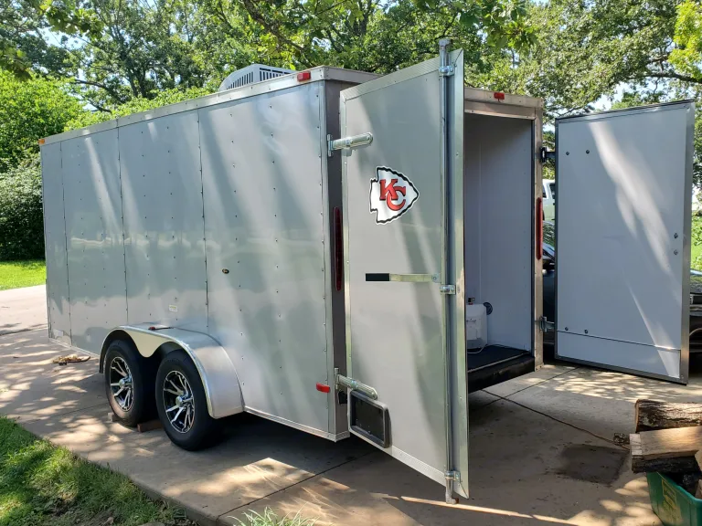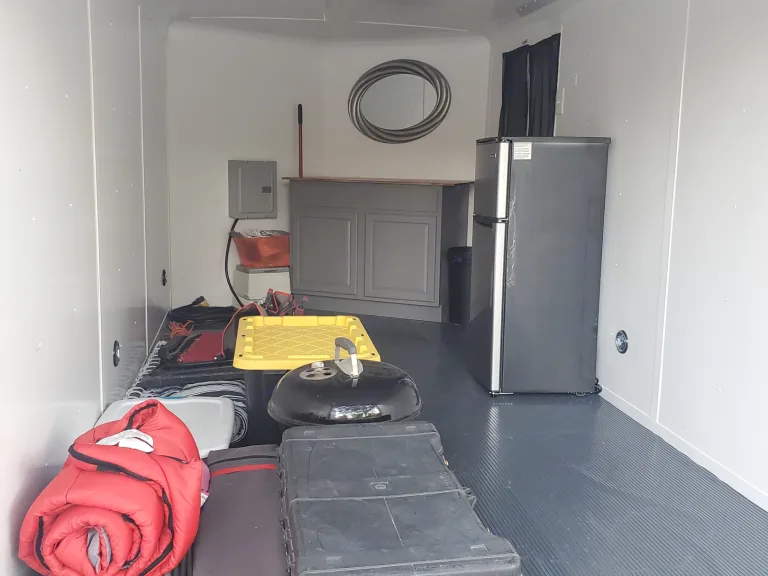 2019 cargo trailer. It has a cabinet to hold all kitchens supplies, refrigerator. Electric hookup, ac/heat, insulated. Small porta potty, air mattresses provided. What's includedPots, pans, plates, cups, bowls, silverware, spatula dish towels, dish cloths, paper towels, dish soap, coffee pot, griddle,camp stove, BBQ grill, air mattresses, pillows, sheets, blankets, bath towels, shampoo and soap, toilet paper chairs, table, extension cords, first aid kid, Porta potty foldable canopy refrigerator.RecommendationsCampgroundsOther things to noteThis is an agreement that you understand and agree, you are responsible for any damages both interior and exterior loss or theft of contents, or the vehicle which includes the cost of any repair or actual cash value of the vehicle. Smoking is not permitted inside.