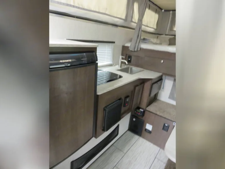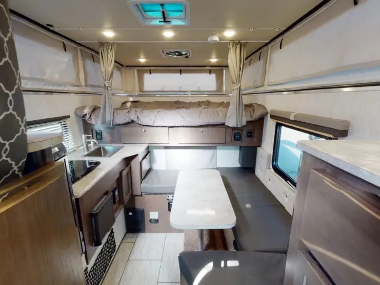 Thule roof rackThis SS 1500 soft side Palomino Backpack Edition truck camper makes traveling easy and luxurious. The queen size bed with 360’ window views feels like you’re sleeping in a tree house. The dining table turns into a spacious sleeping area for 1 adult or 2 small children. The indoor and outdoor showers allow you to clean up without having to use the camp facilities. Whip up some dinner in the full kitchen with a two burner cooktop, refrigerator/freezer and sink with on demand hot water.