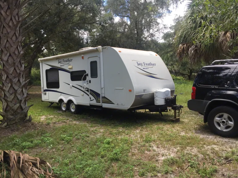 Centrally located near the area's most popular campgrounds and natural springs! Easy to pull for novice campers. Delivery available depending on distance.Camper weighs only 4300 lbs and can be pulled by most 6 cylinder Suvs. Very easy to pull for those novice campers! Anti sway bars/ weight distribution provided for piece of mind while towing.21 ft. 2012 Jayco JayFeather Ultralight.. with 6 ft slide out. Sleeps 6 comfortably, King size bed with pillowtop mattress, full couch bed, full drop down table bed, 2 single size bunk beds. Bring the whole family for a relaxing camping experience. Pets welcome at no extra charge! Located within 15 miles of Central Florida's most popular campgrounds and natural springs such as Silver Springs, Rainbow springs and Juniper Springs. Coffee maker, silverware, pots, pans, utensils included. Camper is equipped with small refrigerator, double sink, microwave, gas range stove top, and flat screen TV. Equipped with inside and outside speakers, outdoor shower and custom built bike rack. A/C works great for those hot Florida nights. Requires 30amp hookup. Two night minimum stay. Propane will be provided to use when hookups are not available.Rental includes LED string lights and two camping chairs** Grey and Black Holding Tanks must be dumped before return or 50$ dumping fee will apply **