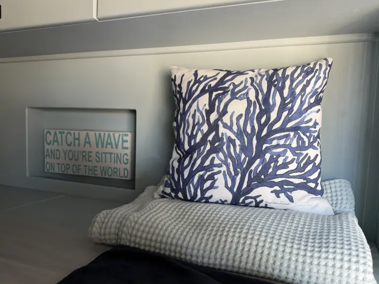 Gladys is a Stealthy Land Yacht you can park anywhere you find a standard size parking space. She’s not small but efficient and has plenty of headroom and a luxury queen size bed. Her fully custom, professionally built interior is classy, yet uncluttered featuring a stunning galley with hand-crafted cabinetry. The counter is birch butcher block surrounding an oversized, modern Apron-front farm sink with a commercial style pull-down faucet.Gladys, the Promaster 2500 High Roof has low mileage, gas efficient (av 15 mpg), meticulously maintained and features a gorgeous, low maintenance ceramic coating on the exterior. All cargo windows (3) are one-way privacy windows and all windows (6) have magnetic black out screens for sleeping and privacy.Gladys sports an upgraded suspension, MaxAir roof fan, 350w solar panel and two modern all purpose EcoFlow Lithium batteries that combine the 12V system with the 120V system to power everything onboard and recharge off the 350w solar panel during daylight hours.Her queen size bed (Ease frame) easily turns into a couch for reading or watching a video — raise your head or feet with the touch of the remote control! The Nectar 12” memory foam mattress is more comfy than my bed at home. Hypoallergenic pillows, blankets and dish towels are included and fresh, luxury bed sheets and bath towels are an add-on.The galley includes custom utility drawers, a large cutting board and toaster roasting oven. For outdoors, a Jetboil stove and Skottle grill are also available. The sink is large enough to wash your hair in and there is a 2.5 gallon hot water heater under the sink. The Frig/Freezer is a Dometic 75 CFX (doubles as a table or chair) and is on a slide out from under the bed frame. The toilet is a portable unit, easily stowed under the bed as well.The large slideout door (with window) has BugWall netting installed to keep the bugs out — it’s magnetic open/close so very easy in/out.Plenty of storage in cabinets by and over one side of the bed and also under the bed.The 30 gallon water tank is double filtered and there is a 20 gallon gray water tank underneath the van.The van is Black however she’s fully insulated and with the Max Air fan running and blackout screens on, she stays cool inside. The van’s AC will also cool down the interior quickly as well.Build in USB plugs and 120V outlets conveniently located.Passenger seat swivels to face the interior of the van.Gladys is the perfect Glamping vehicle for National Parks or getting from place to place. Most Florida campgrounds insist on vans being Titled and Registered AS Class B, which she is. She does not have an enclosed bathroom or shower (one reason for her Extra space, Zero smell and competitive rate). She does have a High End Dometic push-button, flushing cassette toilet that stealth stows underneath the bed and is portable. The bottom cassette is easily emptied in any toilet. Then there’s the awesome farm sink … you can almost take a bath in the sink (I wash my hair in the sink and sponge bath for those travel days in between a campground or other locations with shower facilities, LOL)I would prefer you contact me (text is best) with any questions, at any time, other than waste any of your vacation time figuring things out with the van or any interior systems. I’d also love to hear how your trip is going!What's included• Pillows, Bedding, Dishtowels, Galley setup