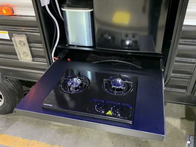 Locate ‘BLACK WATER ONLY’ bin. Inside this bin, you will need to find the sewer hose elbow. Insert that into the dump location at your campsite. Locate the sewage hose in the rear bumper, behind the magnetic cap. Attach one end into the sewer elbow, and the other end into the camper. Remember to allow the ‘Grey water tank’ and ‘Black water tank’ to fill all the way, before emptying the tanks. This creates a vortex inside the tank, ensuring all water and debris get dumped.