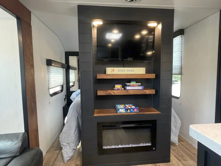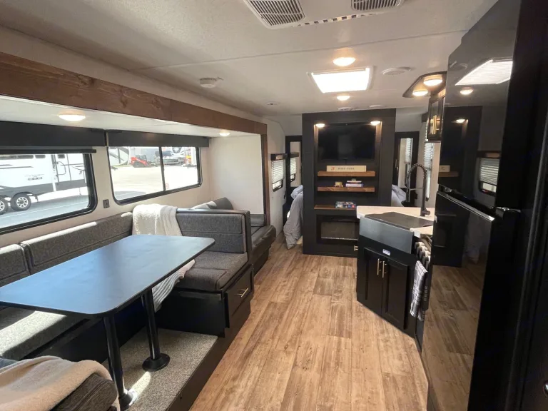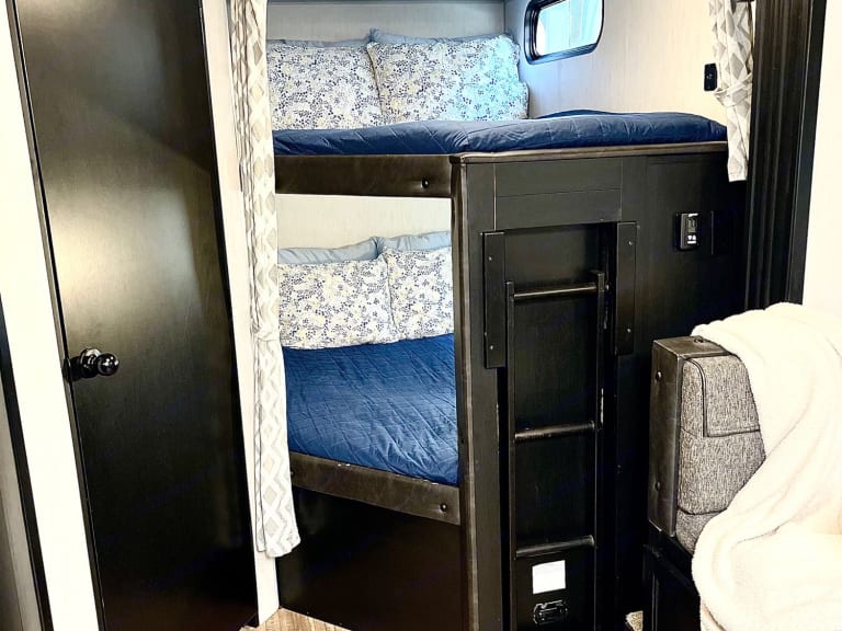 This travel trailer is the ultimate family camper, with a double entry and access to the bath from outside. Sleeps 10 people, fully loaded indoor kitchen, gas oven & stove, and electric microwave! Extra-large U-shaped dinette with full length drawers giving you more than enough storage for camping gear and supplies. There is a lovey two-seater couch, electric fireplace that provides hot/cold air, and a 32" smart TV. Double bed bunk with ladder, provides extra sleeping room for kids and adults, a single bathroom with shower, and a private room with a queen bed! If you're wanting to cook outdoors there is a gas stove equipped with a mini fridge & ice maker.What's includedIncluded Interior Essentials:
