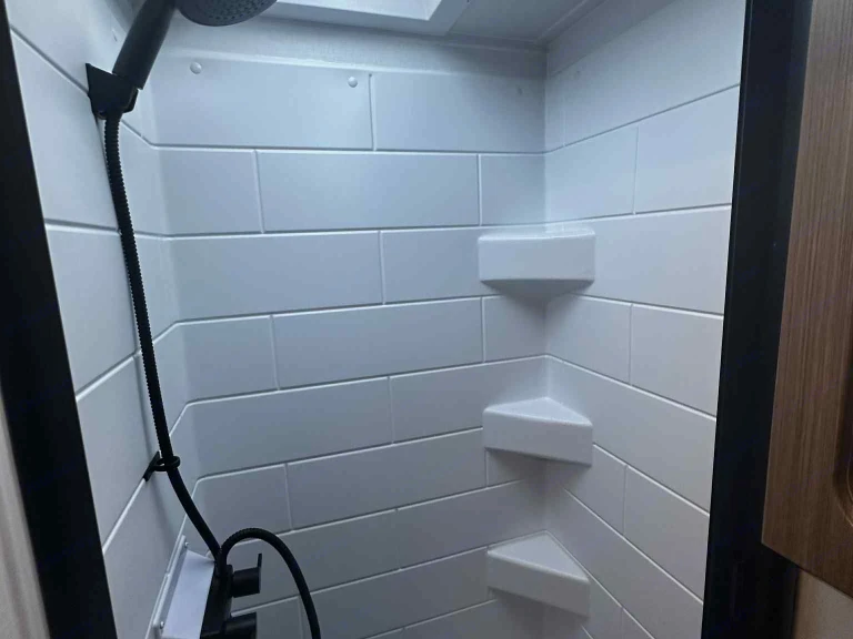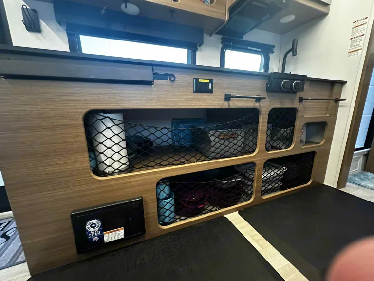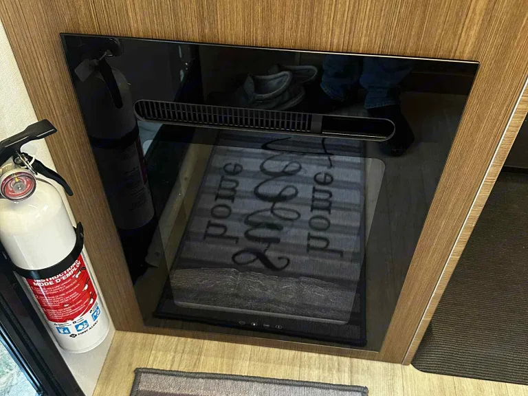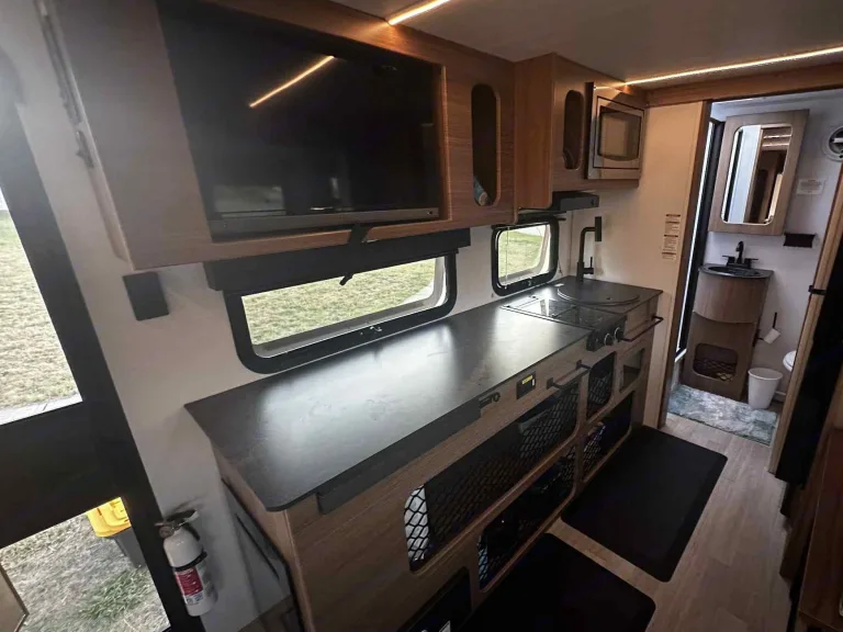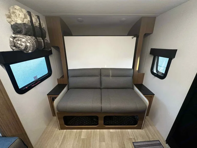 Living Area: Two couches with one having storage underneath and the other couch has two recliners. Both can fold into day beds but one also folds into a day bed so the queen murphy bed can come down.Kitchen: Wonderful kitchen for this size of RV with a two top burner. It also has a pull out counter extender plus a deep sink and nice microwave that also has an Air Fry option.Bathroom: Cozy bathroom that has a stand up shower with two different spots for the shower head for the adults and little ones. Also comes with an on demand water heater instead of the usual small hot water heater.All windows have black out shades or curtains.
