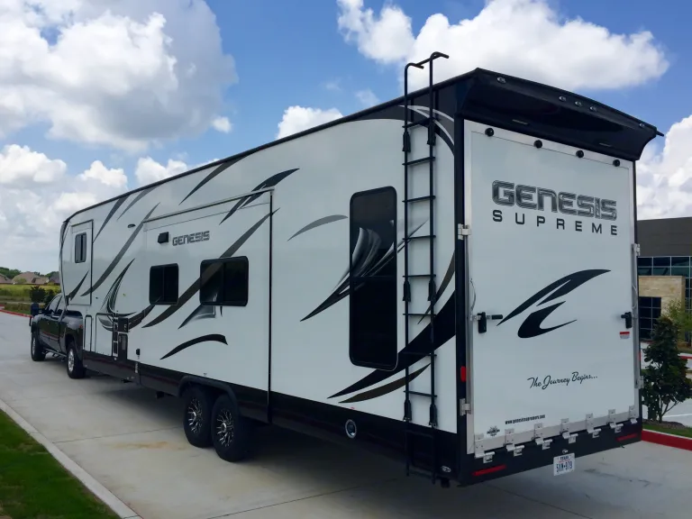 Thank you for looking at our new 2016 Genesis 39' foot 5th wheel Toy Hauler. Our RV is spotless inside and out and showroom new. We have upgraded the factory master bedroom queen size mattress to a plush pillow top bed mattress. We furnish all dinnerware, glasses and master top bedding liner. The unit will sleep eight people, there are two queen size and two full beds. Our RV is very easy to pull and simple to operate and meant to be pulled and used on paved solid surfaces only. It has room in the 22.5' foot garage for 4 Harley dressers, golf cart, canoes, kayaks or a Polaris 4 person Razor with 14 easy to use factory 2500 pound tie-down rings, secured to the frame and recessed in the floor. It has a solar panel on top and 5500 generator to keep the batteries charged when auxiliary shore power is not available and pass through storage under the unit. It has three flatscreen TVs and including a large TV entertainment center with speakers outside. The RV should to be returned clean in the same condition delivered to you at time of pick up to avoid an additional cleaning fee. We strive to keep our RV in showroom condition inside and out for all of our guest. We'll also deliver and set up for an additional fee such at family reunions, Nascar races, etc. We give a discount if renting for a week or longer. Thank you again for looking and please email or call with any questions.