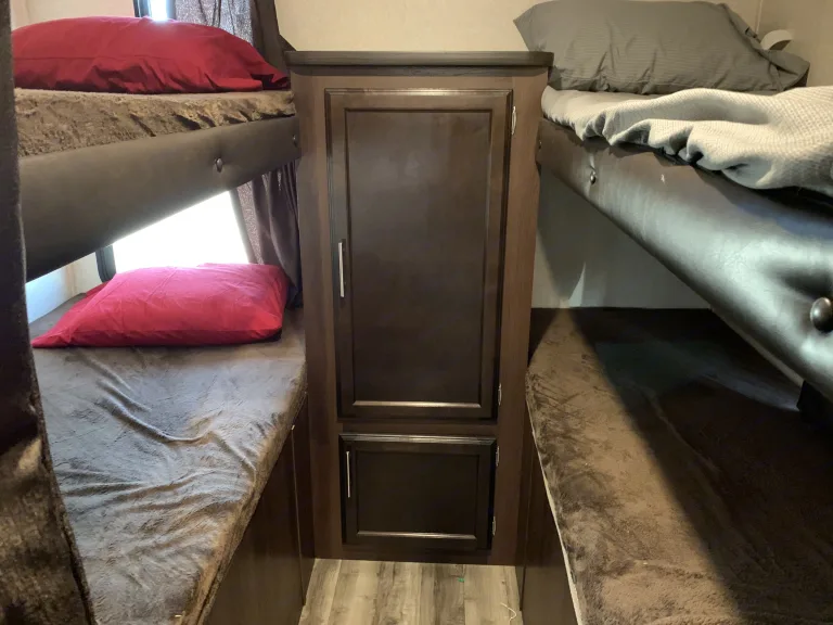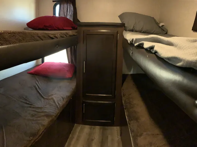 Enjoy the campsite in this great half ton towable bunkhouse. The Jayflight 295QBS has quad bunks in the rear, a large U-shape dinette which will sleep 2, a jack knife couch, and a queen bedroom in the front. To keep you cool this camper comes with 2 AC's and boasts a large walk in shower and an outdoor kitchen.