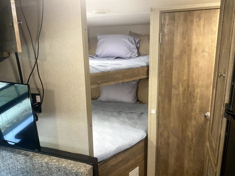 ***See the overview video at https://youtu.be/d680TmIWw3I ***All you need is included in our campers. Reach out with any questions you may have.At only 4300 pounds and 26 feet long, this camper can be pulled by a half ton truck and some SUVs and still has plenty of space. Fully stocked ready for your next get away. Queen bed, 2 full size bunks rated at 300 lbs capacity and convertible dining area allow sleeping for 7-8. Outdoor kitchen allows you to fully enjoy the outdoors. Pair it with our Blackstone griddle available for rent and you have a spot for cooking anything outdoors. Pets allowed upon approval!Trailer has all you need for your trip: