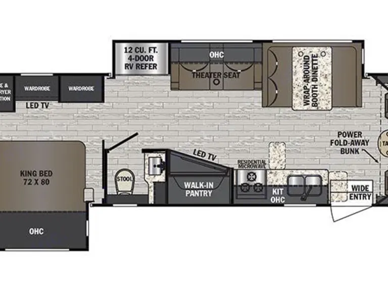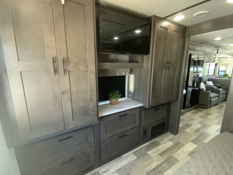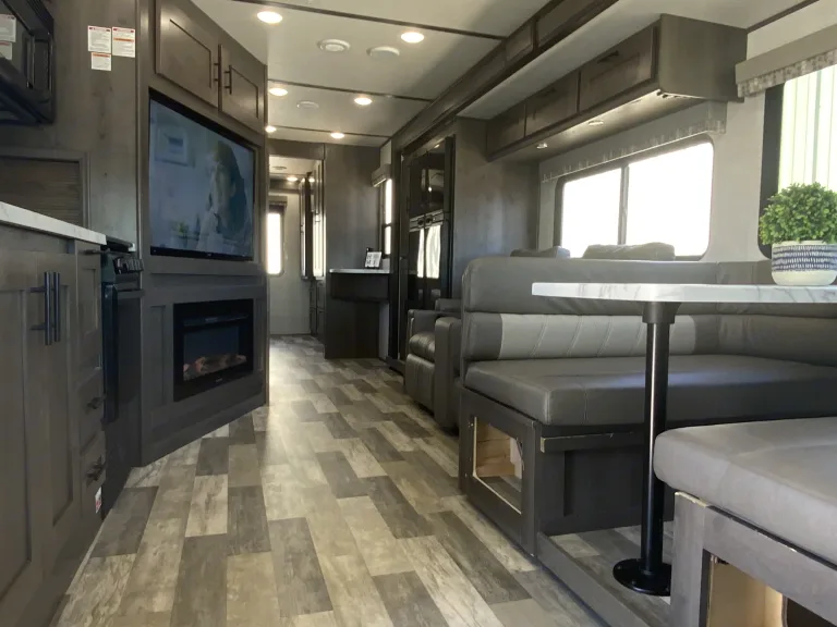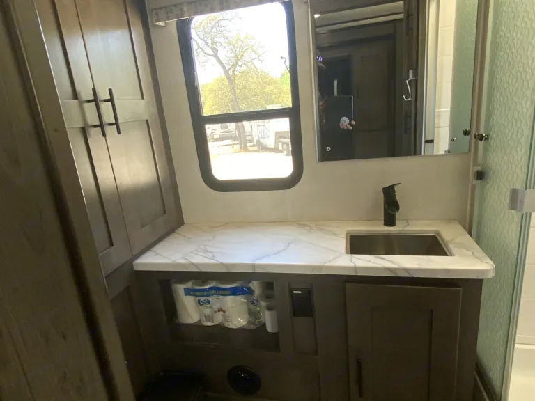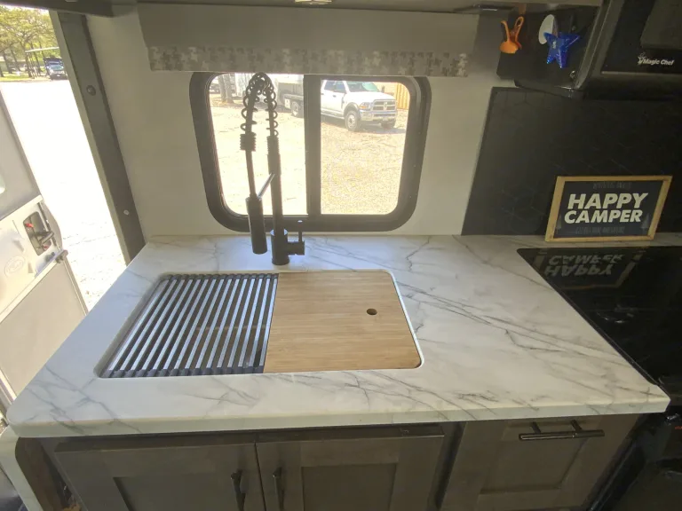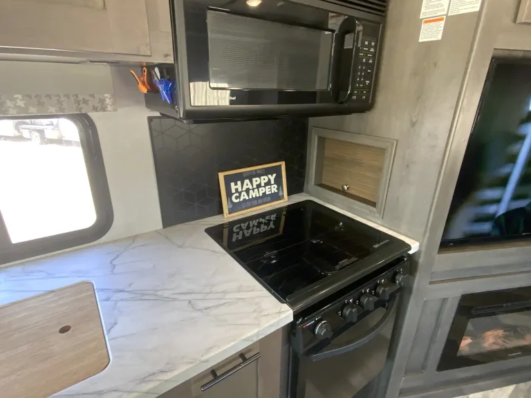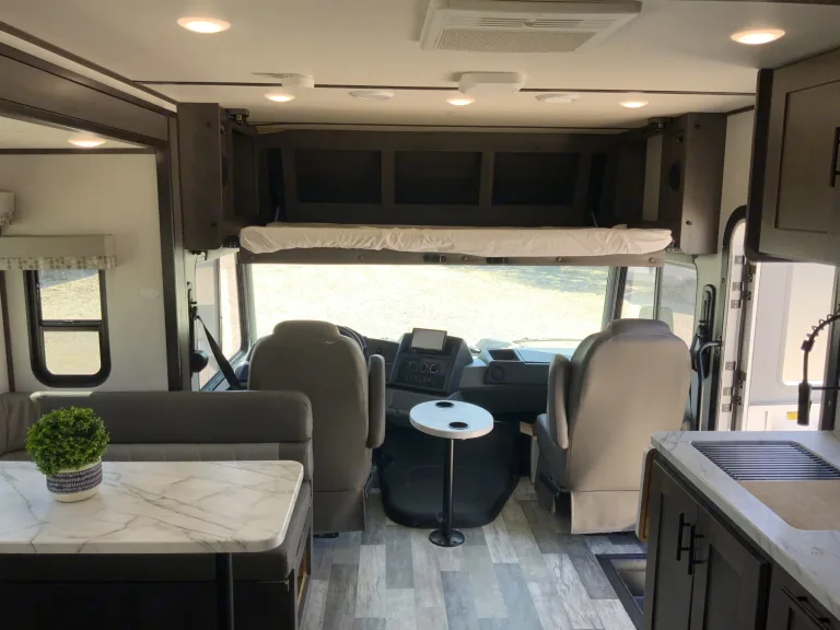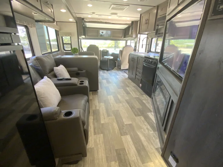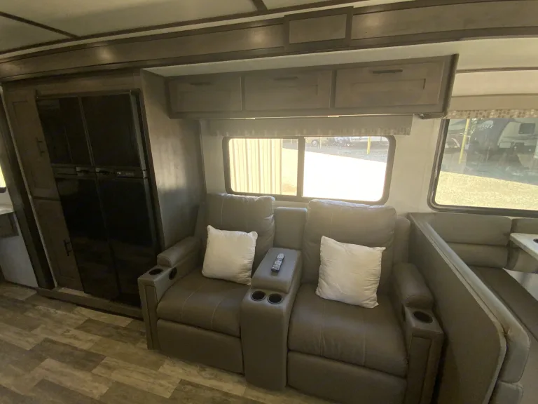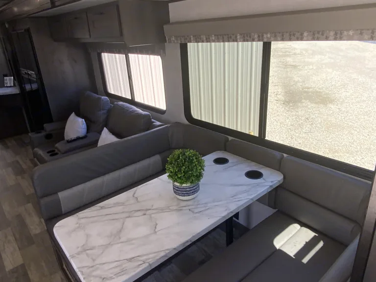 The FR3 Class A trailer is a cozy and inviting space, comfortably sleeping up to five people. It boasts a king bed in the back, made and ready for a restful night’s sleep, and a bathroom fully stocked with all the essentials. The kitchen is equipped with all the necessities for easy meal prep, and the dining table conveniently folds down into a queen bed (extra sheets available upon request). Two comfy recliners provide a perfect spot to relax and unwind after a day of adventure. A twin-sized bed above the cab is also made up and ready to go. Plus, we’re happy to welcome your furry friends—dogs are allowed, so your pets can join in on the fun too! This trailer offers everything you need for a comfortable and enjoyable getaway.