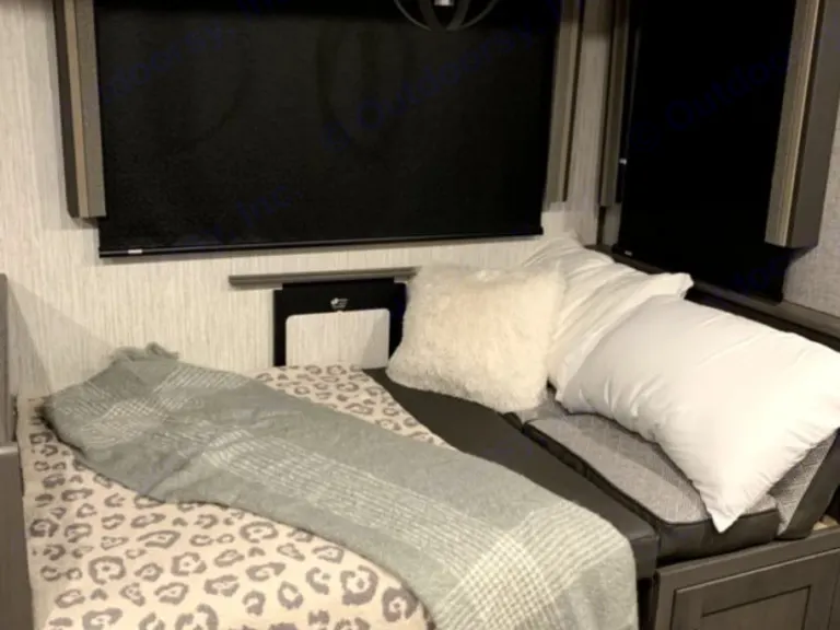 You can enjoy watching the 40" LED TV from the theater style recliners or the dinette. The dinette easily turns into a bed to sleep 2. The sofas recline very far back and can be used to sleep comfortably as well.The private bedroom features a 72X80 King Size Bed with a comfort mattress and a memory foam topper, along with two nightstands, reading lights, and USB charging ports. Plenty of storage under the bed and in the built in cabinets.Please feel free to reach out with any additional questions. Happy camping!What's included-Bed Linens