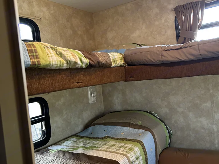 Queen bed, the three bunk beds, and fold out coach sleeper. Beds will be made and ready to go! We also will provide complete sets of towels.