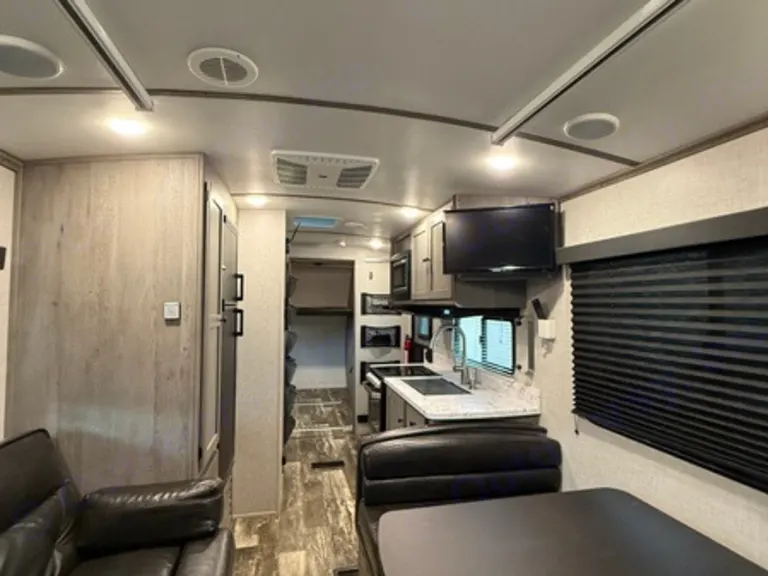 Front Garage/Cargo Area with ramp door – perfect for hauling ATVs, bikes, gear or wheelchair with tie down hooks.Rear King Bed Slide-Out that maximizes interior space without extending overall lengthOne Flip-Down Bunk in the front garage area – great for kids or extra guests. also fits a king size air mattress in the empty garage area. (not included).Dinette that converts into an additional sleeping areaFull kitchen with 3-burner stove, oven, microwave, double-door refrigeratorEntertainment system with TV.