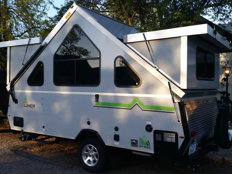 Enjoy the convenience of an A-Frame pop up camper. This Aliner has hard sided dormers that are easy to set up. This camper has everything you need to stay self contained while boondocking or fully connected in a campground RV space. 18 ft long end to end and weighing about 2200 lbs for towing with light duty vehicles. There is a two burner propane stove top and 3 way Dometic refrigerator. There is a shower and flushing toilet built in. Full size vanity sink and storage. This Aliner has large windows to let in light and window ventilation along with a two way reversible fan to vent the air out of the top. Two propane tanks and a battery that will charge through your 7 way plug from your vehicle. This camper sleeps 2 adults on a full size bed and 1 child on the convertible sofa. Hot water heater and furnace are in working condition. What's includedIncluded items:
