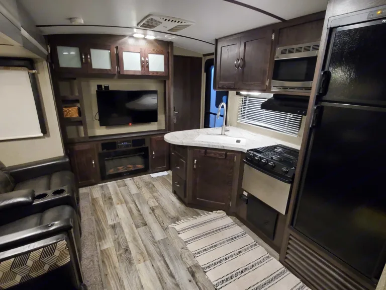 Vacation with style in this beautiful travel trailer. With modern style white counters and dark woods you are sure to feel like you're glamping. Master has East/West slide out King bed with dresser and closet. Leather captains chairs in living room with electric fireplace. Dinette benches convert into optional bed. Bunkhouse bunks can fold up to make room for small ATV/Motorcycle with Toyhauler ramp. Kitchen with double-wide sink, 3 burner gas stove, microwave, medium size fridge, pantry. Outdoor stove and sink. Outdoor shower.Generator use optional for backup. Bike rack optional (holds 3 bikes). Hitch and sway bars optional. Must have 3/4 ton (2500 or 250) truck to haul. We reserve the right to cancel reservations if you do not have an appropriate vehicle to haul. Delivery optional depending on location, for additional fee. It may be possible to deliver farther than listed if the dates work for us. No smoking. No pets unless approved.What's includedBeds: linens & pillows (6).