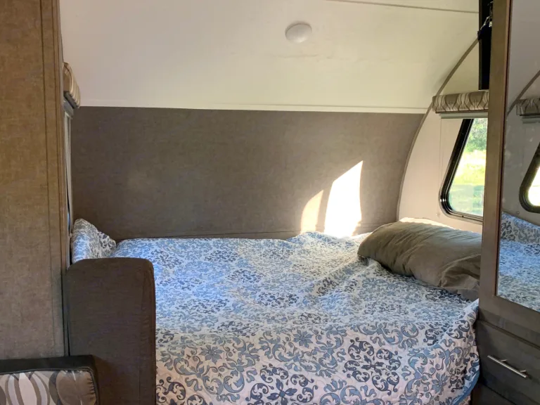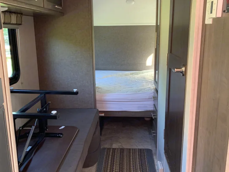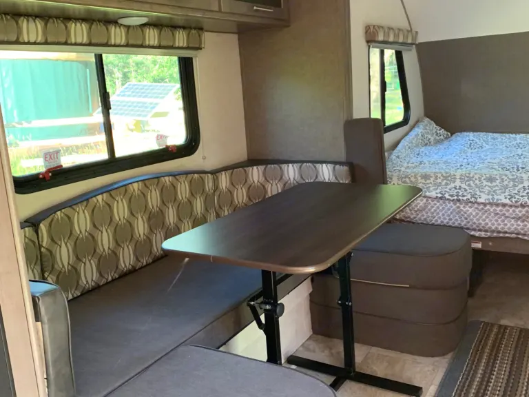 You're gonna love this versatile travel trailer to get out an explore! It's not too big, not too small, and has a low tow weight of about 2,800 lbs dry. It's is easy to pull into most managed campsites. Fits 2-4 people and has all the basics you'll need. Simple modern layout with lots of storage! Kitchen table converts into a bed. Queen bed with memory foam topper sleeps two. Kitchen includes stovetop, microwave, refrigerator, and sink. Indoor/Outdoor sound system included. TV with hdmi hookup. Also features an exterior awning for shade. Propane tanks included in day rate. Solar panels are an option if you want to go off the grid.Dry weight 2800, Wet 3500, does not include your gear.Please Note: If RV is returned dirty there will be a $150 charge assessed. If RV is returned with septic NOT emptied and flushed there will be an additional $150 charge assessed. This is non negotiable.