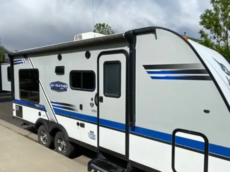 Camp in style in the Jay Feather! With a king size bed, two bunk beds, a fold out couch, and a convertible dining table there's room for everyone! We will provide bedding and blankets to keep you cozy. A nicely equipped kitchen includes a sink, stove, oven, and microwave - we'll provide dishes and a coffee maker to make your trip easy! The camper has a bathroom complete with a shower, sink, and toilet. There's also storage space for your personal items. If you're the type that enjoys technology, we also have a radio, CD player, and TV for your use. This camper is ready for your next adventure.