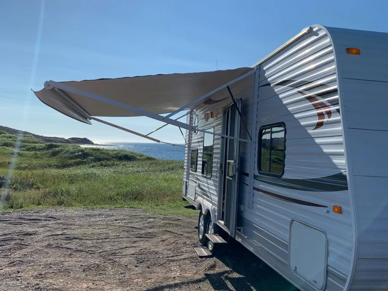The trailer has a power awning installed that is push button operated.