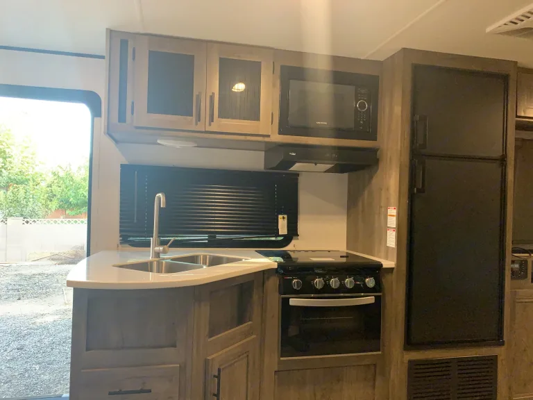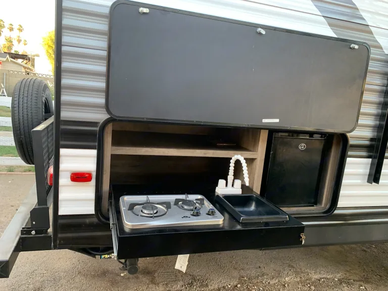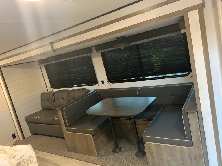 Brand new modern travel trailer with one slide out! Super comfortable. Fits 8 - 9 pple. Comes with a private Master suit & closet space. One spacious bathroom with a tub for the kiddos, Sofa sleeper, U shaped dinette that converts to a bed for two people, bunk beds, TV, microwave, Fridge and nice spacious kitchen. This RV also includes a nice outdoor kitchen and large awning.What's included4 camping chairs, Plastic dishes and Utensils, Fresh and sanitized sheets, Small fold able table, coffee, 4 rolls of toilet paper.Delivery and Pickup available Upon Request.