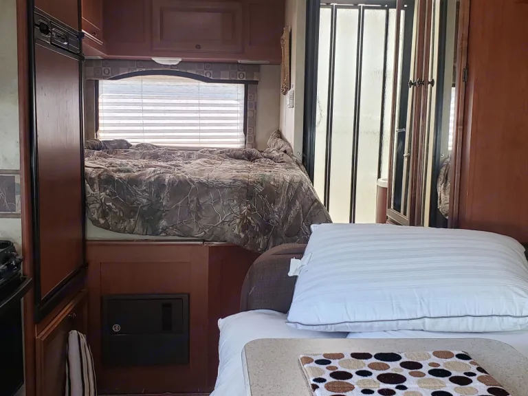 for beginners. It features queen-sized bed, sink, stove, microwave, ventilation and heater/AC, TV.