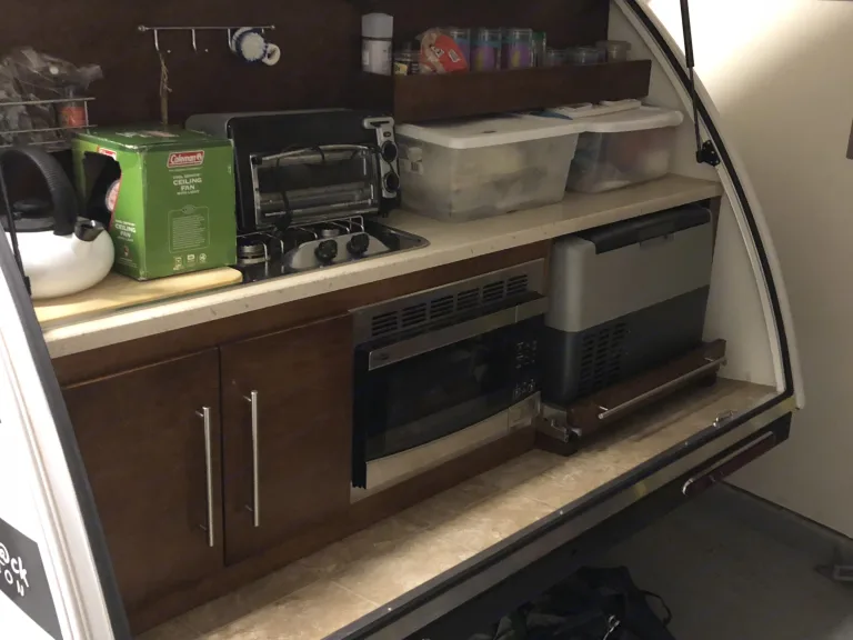 2018 T@G Outback teardrop with a/c, flatscreen tv, outdoor kitchen with sink, stove and microwave. Has king size bed with memory foam topper. Pulls easy with a car, truck or suv, only weighs