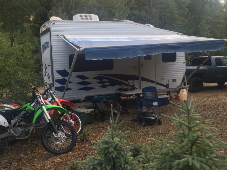 Small toy hauler with king fold down bed. Has small bathroom with toilet and shower, stove top, microwave, fridge, heater, ac, generator, and 15 gallon fuel cell. Perfect for any Moto adventure!!