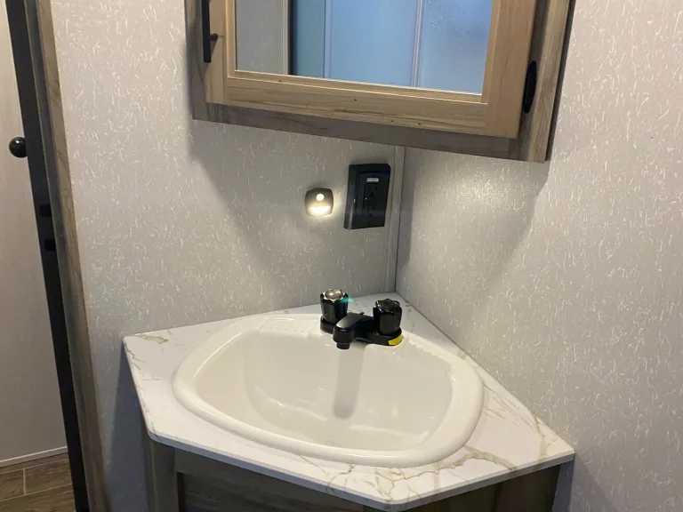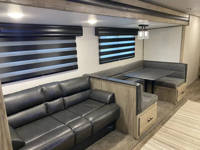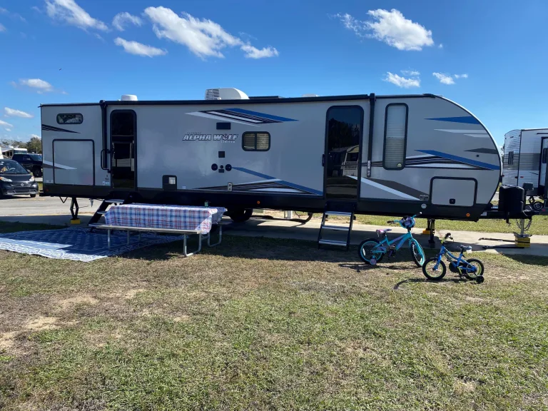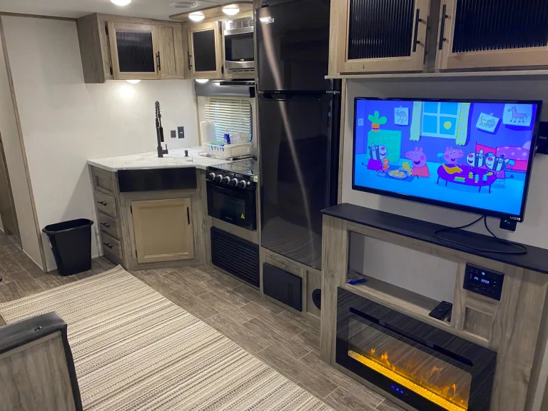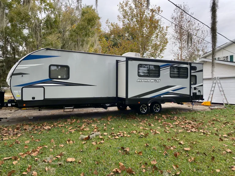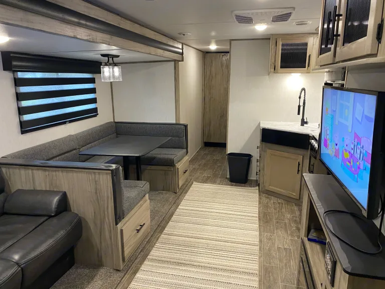 This is a brand new luxury 37' travel trailer. It is large and outfitted with the latest to make your stay very comfortable. 12V refrigerator/freezer will keep your food cold. It has a fireplace and is equipped with ducted Air conditioning and heat for comfort. Regular queen in the master, 3 bunk beds on their own separate room, a comfortable sofa that can sleep 1 and a large dining area that can be converted into a sleeping area. RV is provided with plates, bowl, pots pans and silverware/ cooking utensils.Other things to noteAbsolutely no pets and no smoking are allowed.
