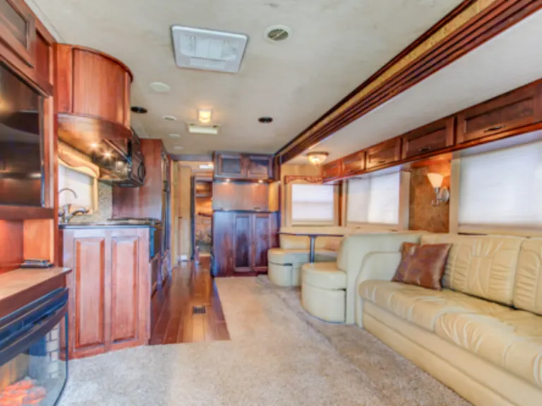 Our Coach has been completely remodeled on the inside. It features 100% leather seating for the driver, passenger, sofa and dining area. Dark, rich cabinets throughout, Corian counter tops throughout, hardwood floors, 55" tv, fireplace, washer/dryer, full size shower and (my personal favorite) a real, residential toilet. Sleeps 6 comfortably. It's powered by a Cummins diesel. And it's a pusher, so the engine and all its noise are located in the back. So it provides a nice, quiet ride. Combine that with air ride suspension and you have an amazing vehicle to drive down the road in comfort and style.
