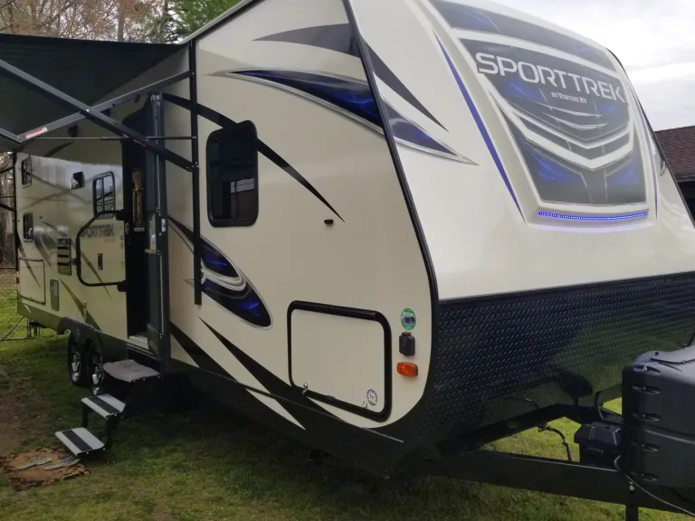 2018 Sport Trek ST270VBH sleeps 8, fireplace, indoor and outdoor kitchens, Indoor flat screen and outdoor smart TV, LED lighting, double bunk beds and queen bed, sleeper sofa, outside shower, 8 cu ft refrigerator (propane or electric), outdoor mini fridge, Bike/luggage rack on rear, Radio with indoor outdoor speakers, Comes with 2 5/16 ball and hitch for 2" receiver and has weight distribution Pulling rig must have 7 pin connection with trailer brake controller. Camper weighs 5500lbs unloaded.
