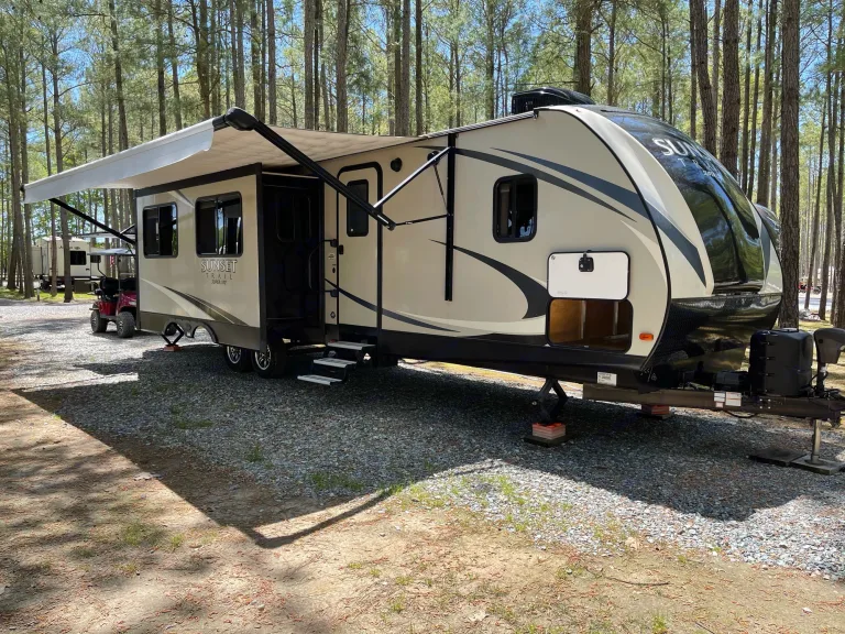 Great family camper with 2 slideouts. Has an outside kitchen with a refrigerator and sink as well as an 18' awning. Master bedroom w/ 13,500 A/C and 24" TV, Full bath, Kitchen has range/oven, microwave, refrigerator, and booth dinette. The living room has a tri-fold hide-a-bed sofa, 15,000 A/C, 39" TV, Bunkroom has a jack-knife sofa, 2 bunks, and a closet. This camper is perfect for families with teenagers as they have their own space, or families with babies as the bunk room can be closed off and fits a regular sized pack-n-play.What's includedWe supply the following: pots and pans, 4 camping chairs, kitchen utensils, plastic plates , bowls , cups, appropriate toilet paper, black tank chemicals, dish detergent, indoor trash can and an outdoor camping mat. You will need to provide your own linens and pillows, toiletries, food and any type of grill for cooking outdoors.Recommendations
